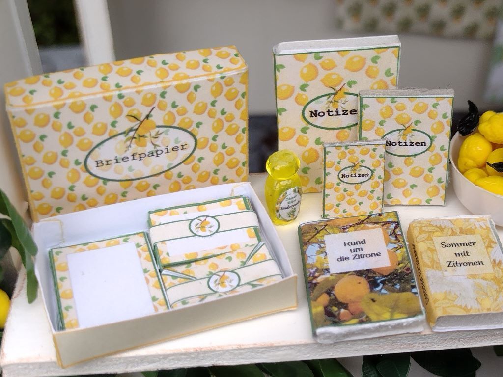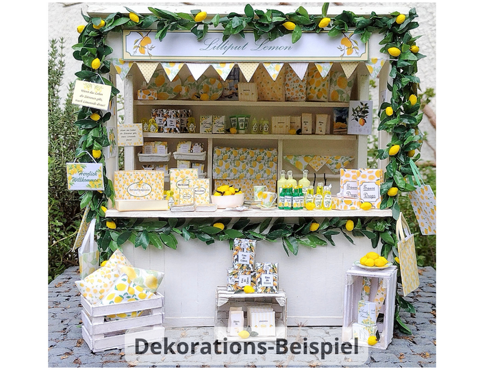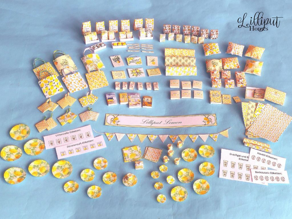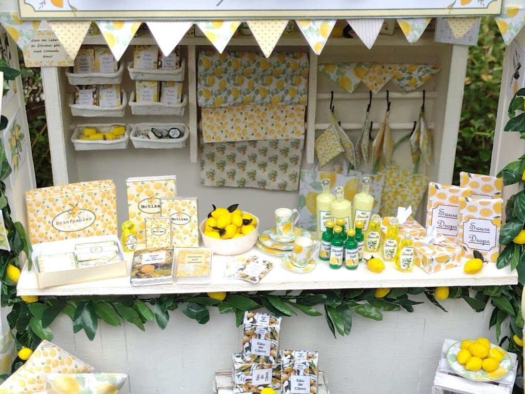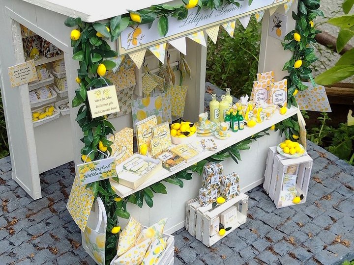 Mit diesen Bastelbögen und der dazugehörigen Schritt-für-Schritt-Anleitung kannst du dir die Miniaturen zur Einrichtung deines Miniatur-Zitronenstands im Maßstab 1:12 basteln.