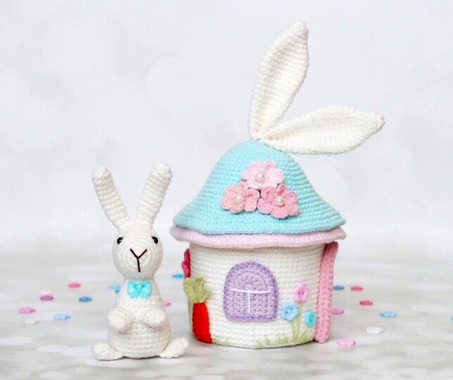 With this crochet pattern you can create cute house for Easter bunny. The house has a secret! You can remove the roof and hide the bunny inside. The bunny is one piece crochet toy, no sewing at all.
