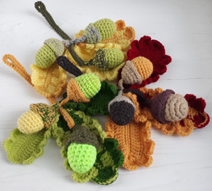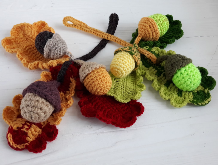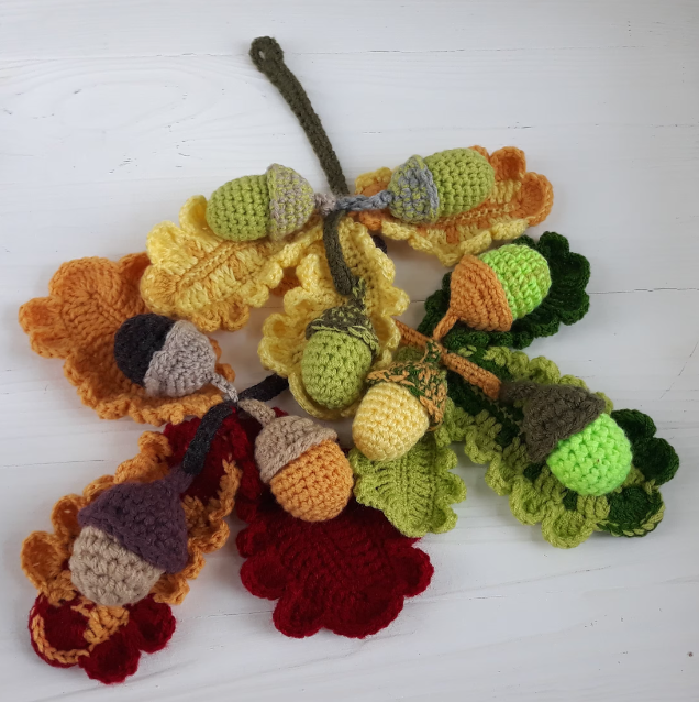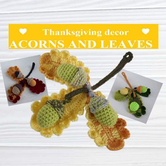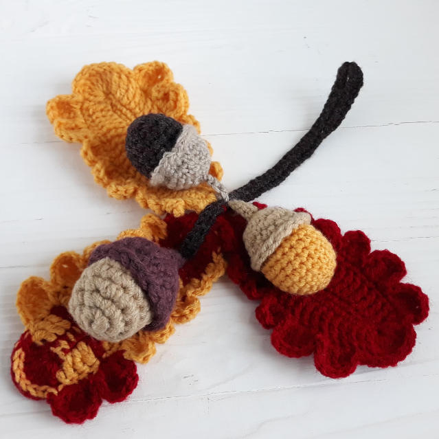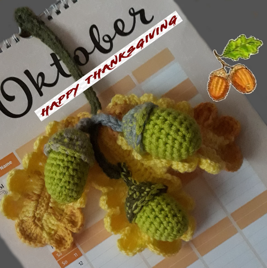 You can crochet as many oak branch for decor as you need. If you crochet several of these compositions, and hang them on a long rope, you will get a decorative leaf acorn garland for Thanksgiving.