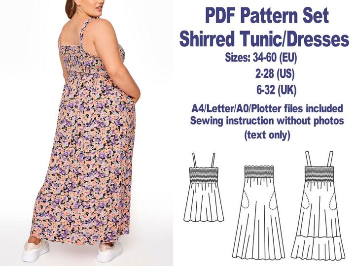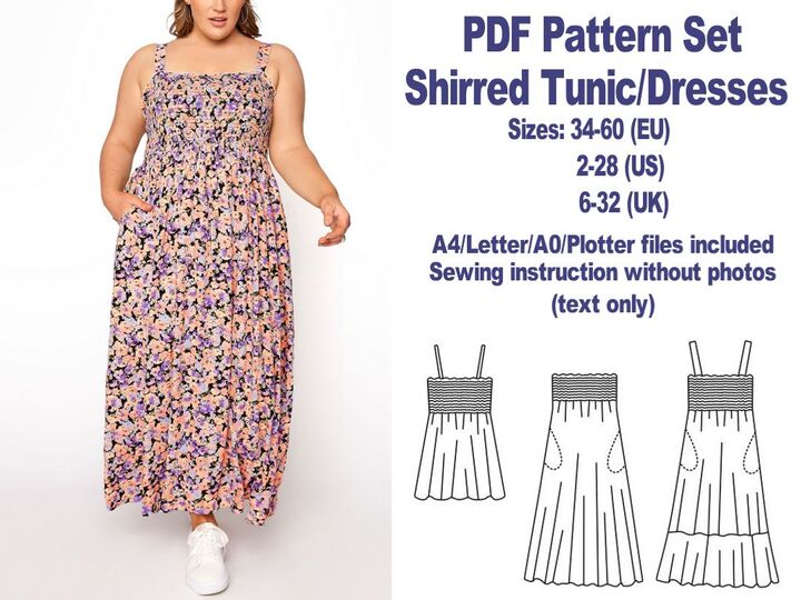 2). Option B: Empire waist shirred maxi dress with in-seam pockets, finished back length from waist– 100 cm.