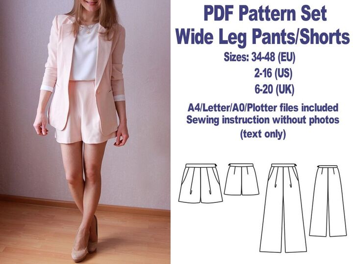 Using this pattern you can make two projects: wide leg trousers and shorts with high waist, pockets and invisible zipper, finished side length from waist – 110 or 35 cm.