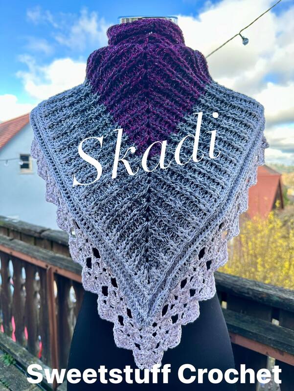 Die Anleitung beinhaltet 2 Varianten des Tuches. Skadi kann entweder mit breiter Spitze und kürzerem Reliefmuster gehäkelt werden oder mit längerem Reliefmuster und schmaler Spitze.