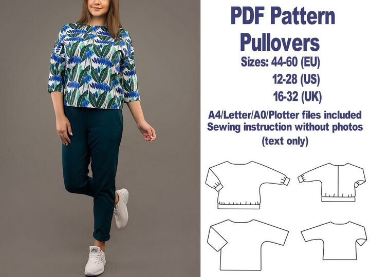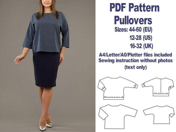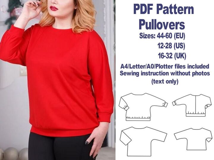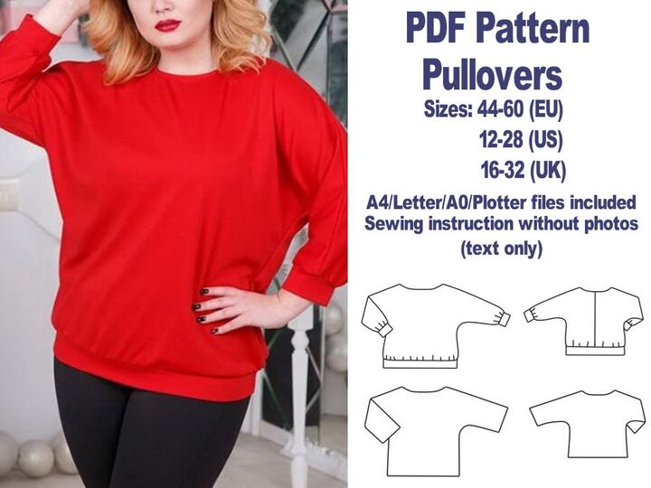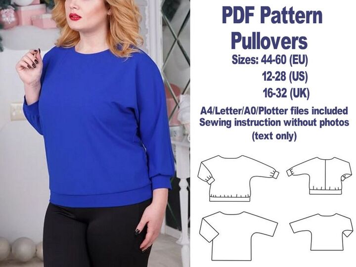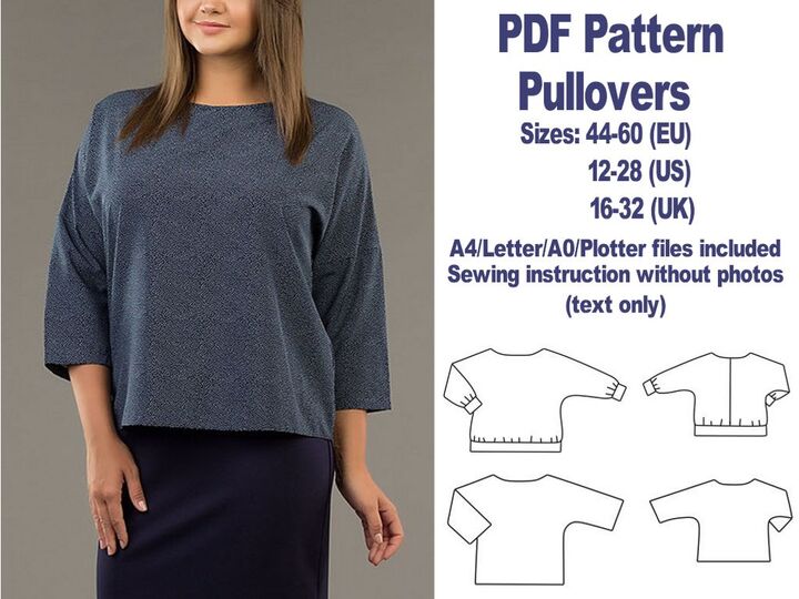 Two types of pullovers with one-piece sleeves, finished back length Option A (with hem and sleeves bands) – 65 cm, Option B (without hem and sleeves bands) – 72 cm.