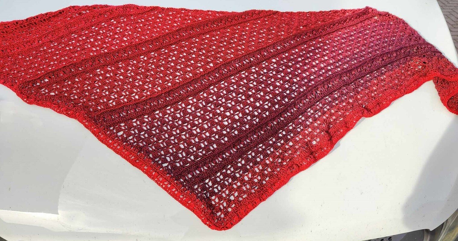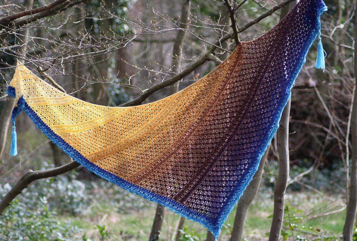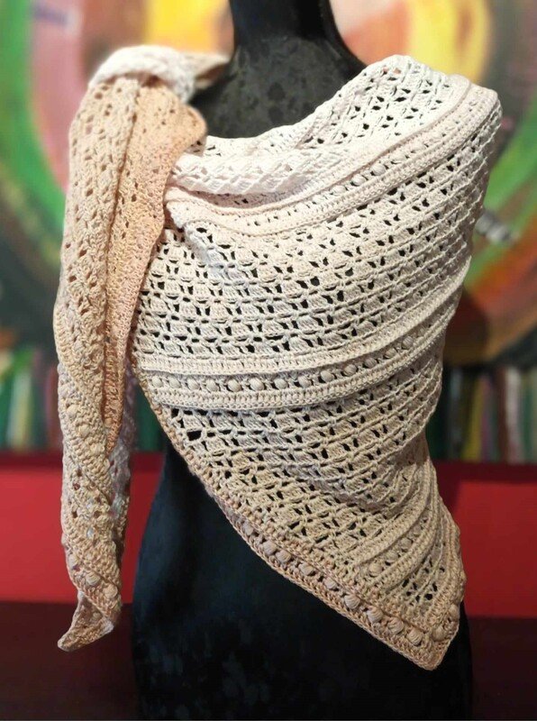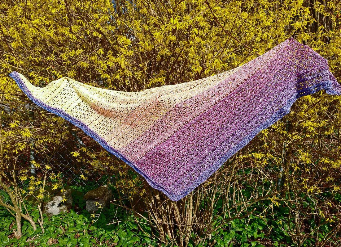 The triangular shawl "Charis" is a wonderful combination of a loose/airy shell pattern with a somewhat denser intermediate pattern of puff stitches. The loose patterns become wider with each pattern set. The shawl is absolutely suitable for making it while watching your favourite TV show, quick to crochet and an eye-catcher for spring!