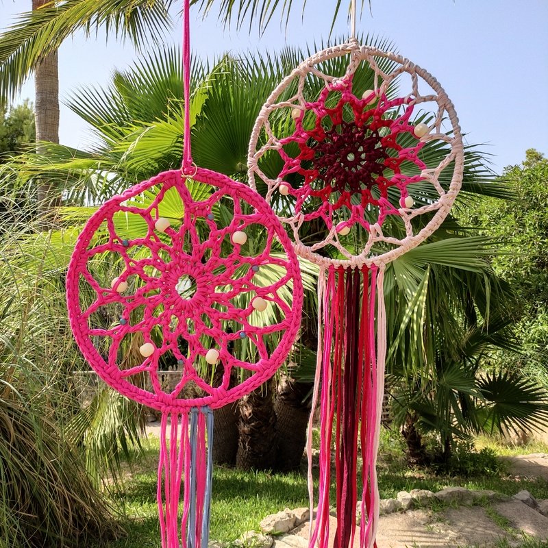 There are two different versions of the dreamcatcher and you can add beads or crochet it in different colours. You can decorate your completed dream catcher with ribbons or trims. You can attach beads, feathers, shells, or anything you like to the ribbons and make your creation entirely unique.
