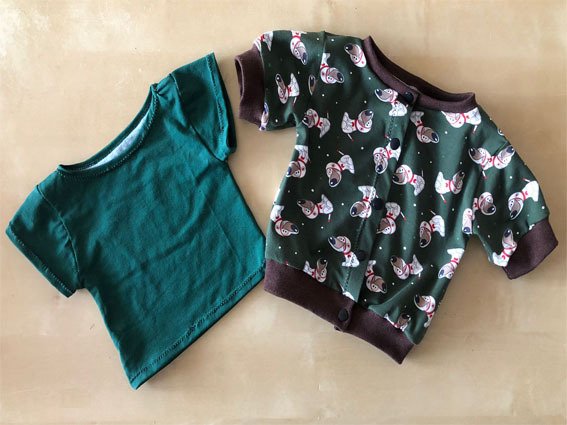 The bear can be sewn from terry cloth, velour, wellness fleece, minky fleece, or other cuddly fabrics. Some pieces of the clothing are made from jersey, and some are made from cotton fabrics.