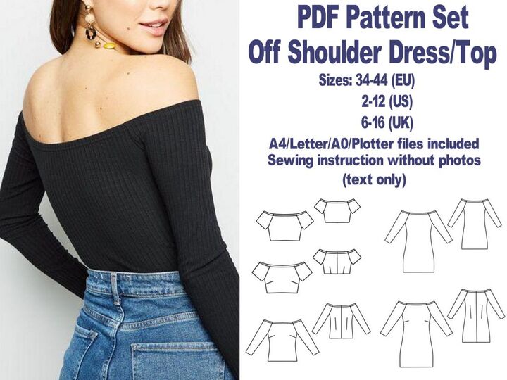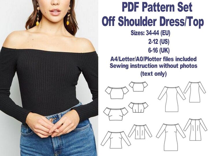2). Off the shoulder long sleeve top with darts or without them, finished back length above 50 cm.