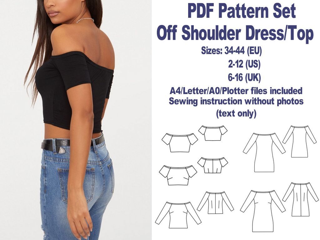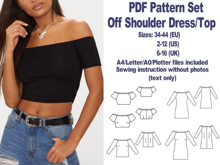 1). Off the shoulder short sleeve crop top with darts (for highly elastic fabrics) or without them (for knitted fabrics), finished back length above 23 cm.