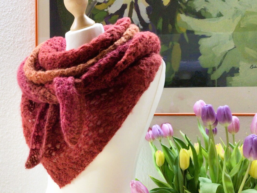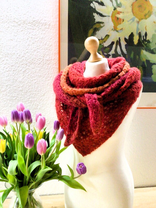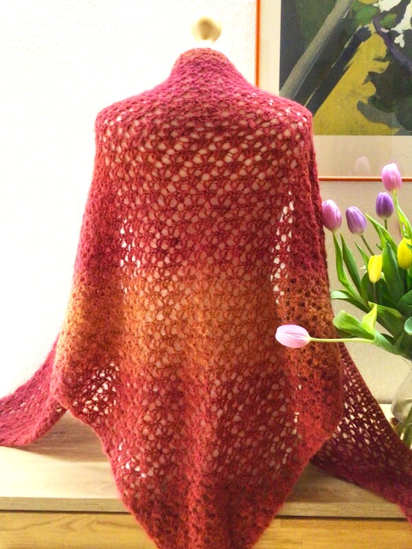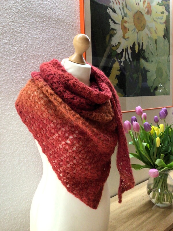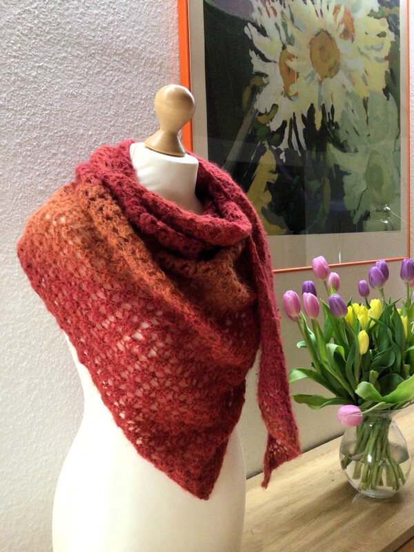 Das Dreieckstuch Thandiwe wird an der Spitze begonnen und durch beidseitige Zunahmen wächst es allmählich in die Breite und in die Höhe.