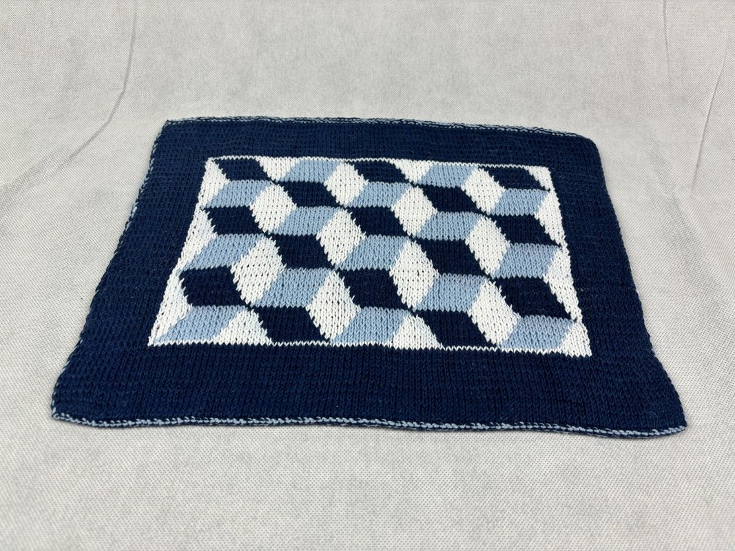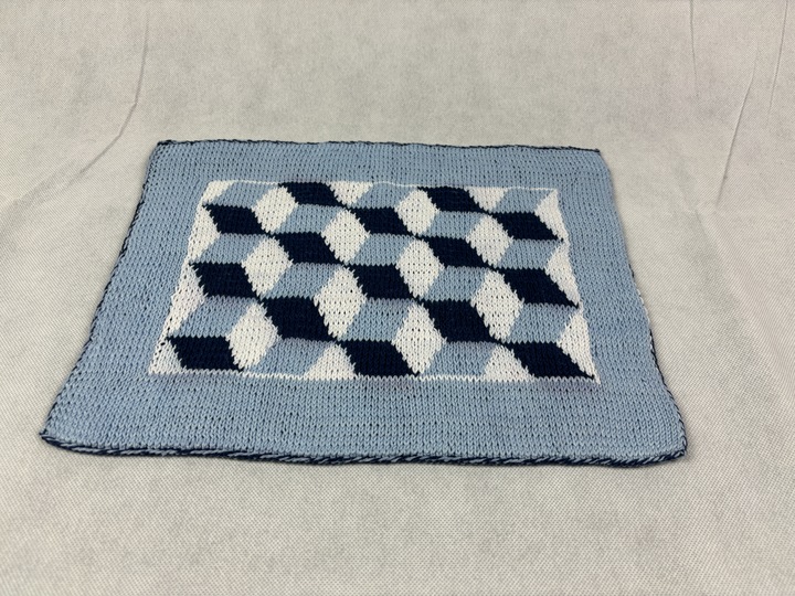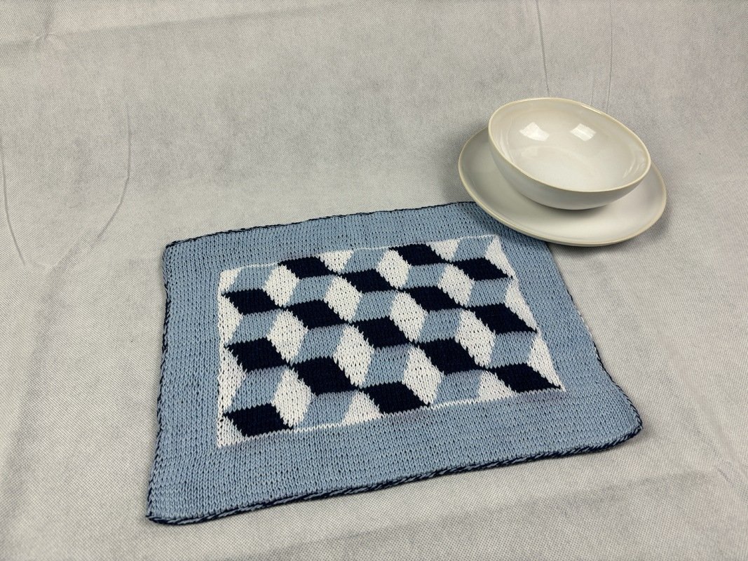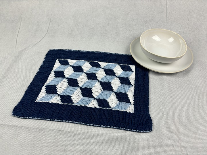 The first piece I have worked using this technique is a beautiful placemat with a 3D look. In these instructions you will find a detailed explanation of double knitting with 3 colours in English knitting style. The instructions also include a short film without sound with some moving images that demonstrate the technique. The double knitting technique itself is not explained in these instructions. You can find a free basic tutorial on double: https://www.crazypatterns.net/en/items/97086/double-face-knitting-a-tutorial