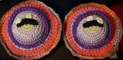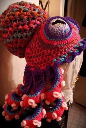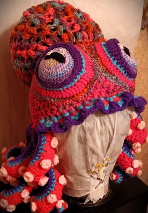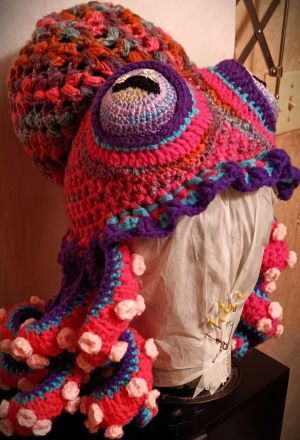 A crocheted Octopus Slouchy hat pattern in a child's size with unlimited avenues of color expression. Inspired by Natalie Allen-TheTwistedHatter. I've changed, modified, added to & incorporated my original ideas to make a children's option by reducing the size of the hat and arms, changing the stitch pattern of the sack, creating actual cup-like suckers, adding a more defined/detailed outlining of the arms/brim & vibrant jewel-tone eyes. The Slouchy part of the hat (sack/mantle) is light-weight and can be filled with a couple wadded up plastic grocery bags, stuffing/wadding or your own hair/dreads.