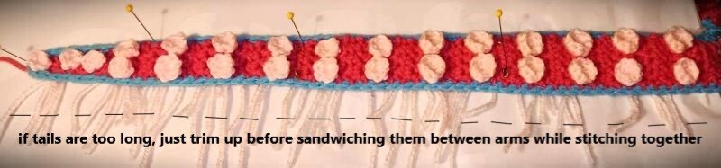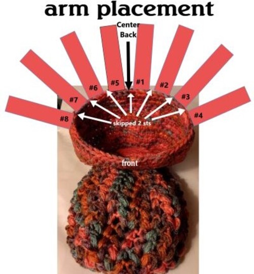 Yarn: approx. 20 oz of #4 medium/worsted/aran weight yarn (divvied up between the 5 main components of hat...sack, head cap, arms, borders/brow fringe & suckers)
