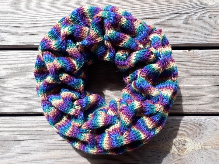 Meilenweit Intenso“ by Lana Grossa (80% wool / 20% PA 150g = 390m), color 9588 and knitted with 4mm circular knitting needles 40cm long (I knit tight). I needed a little more than 1 ball for the neck-hugging loop in the photo. You will also need a 3mm crochet hook and 5 stitch markers.