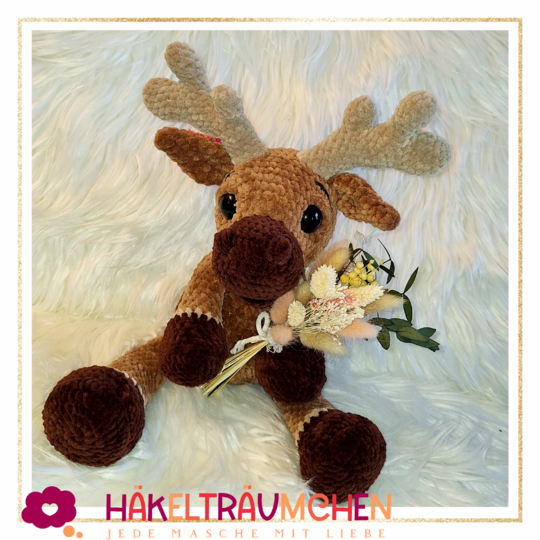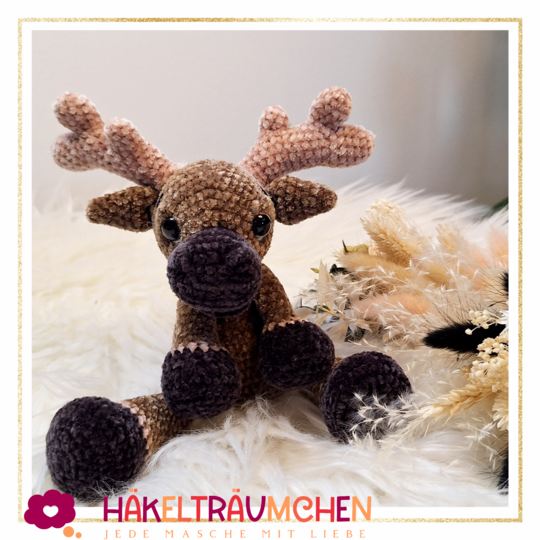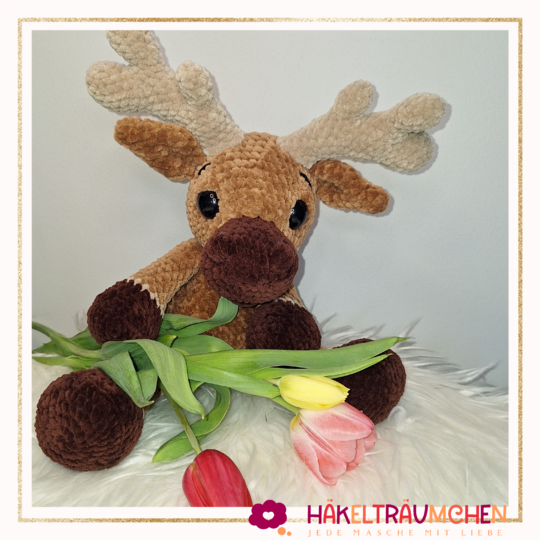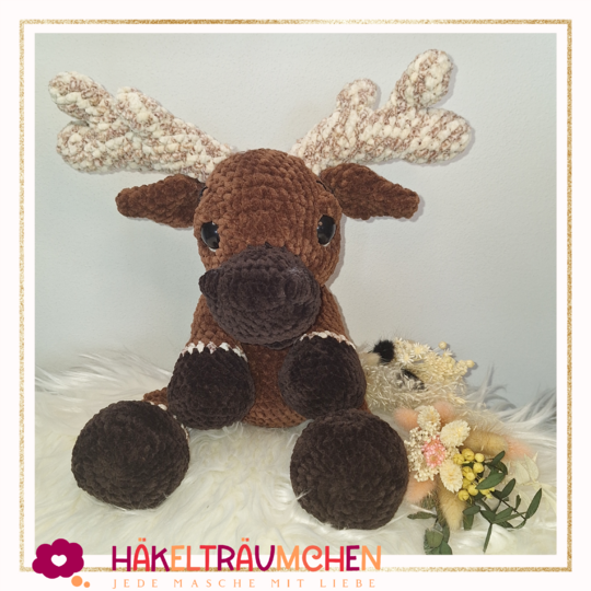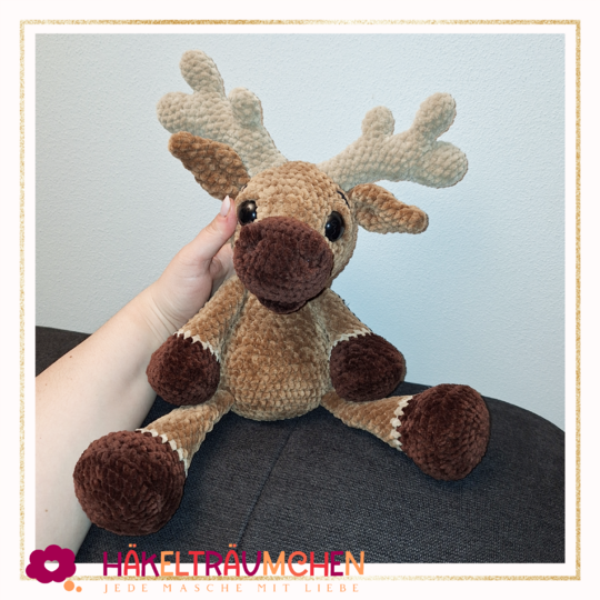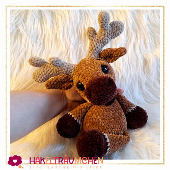 Die Menge hängt davon ab, wie fest du häkelst. Ich empfehle einen Vorrat von 1 Knäuel für die Hauptfarbe und je 0,5 Knäuel der Kontrastfarbe und Farbe für das Geweih.