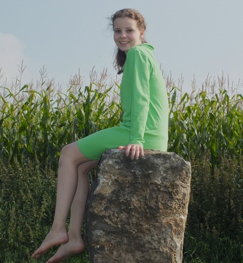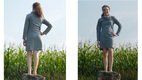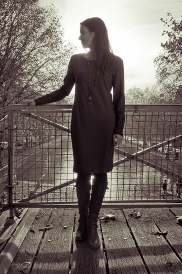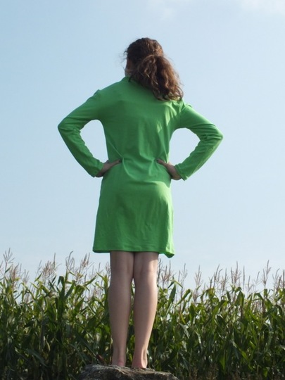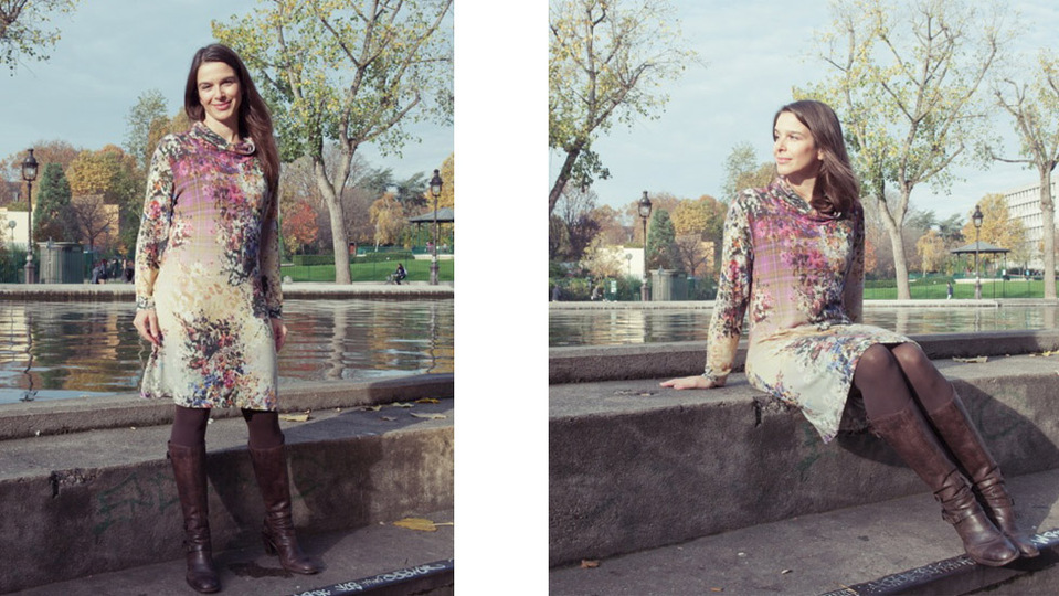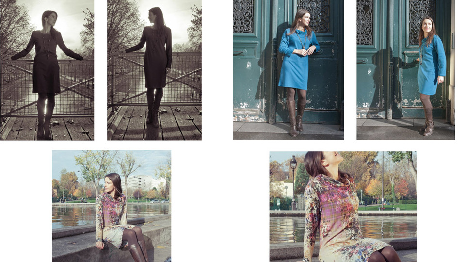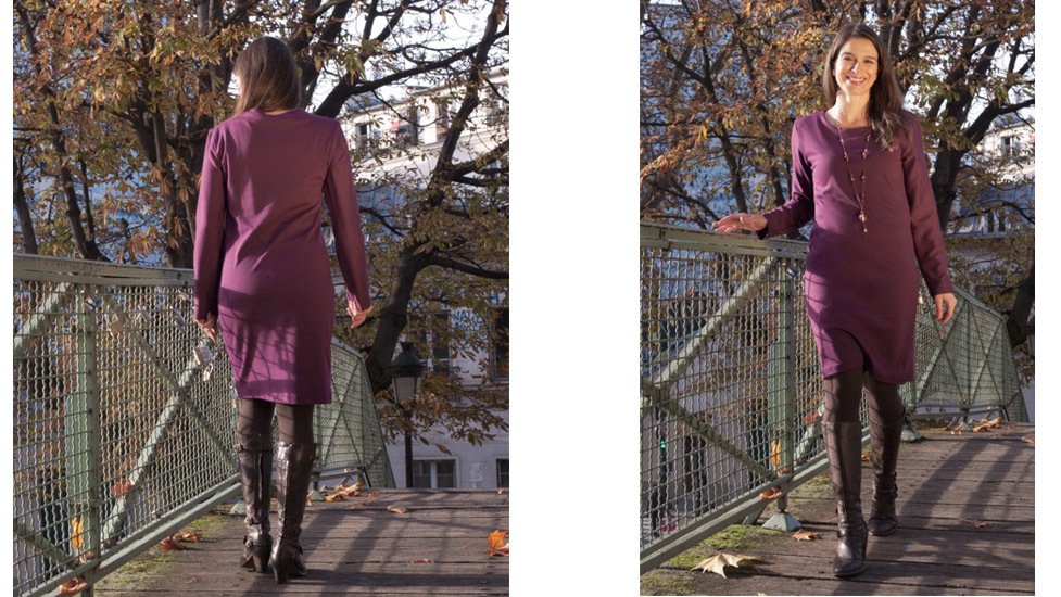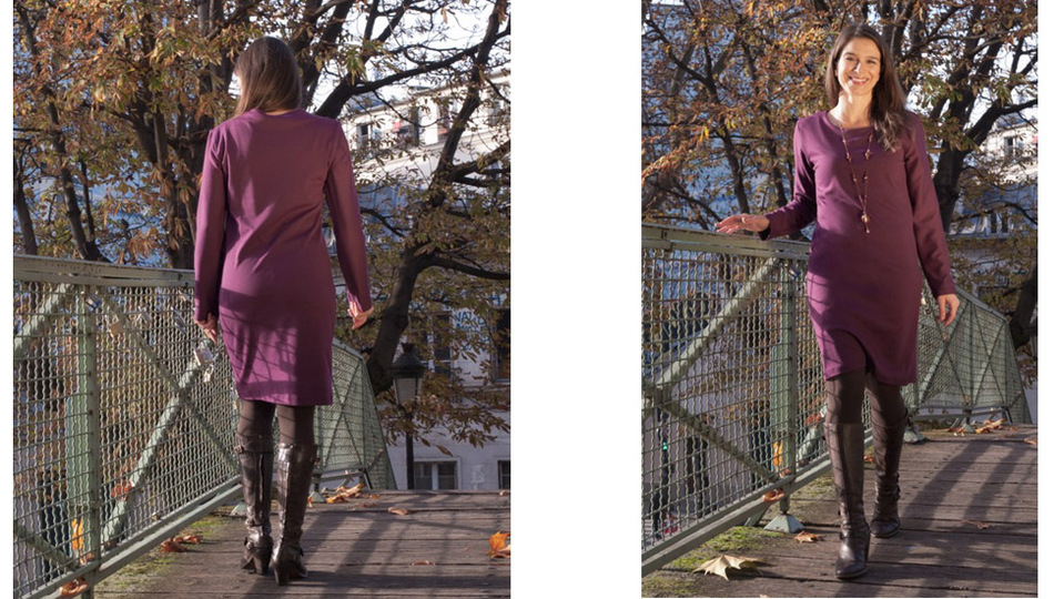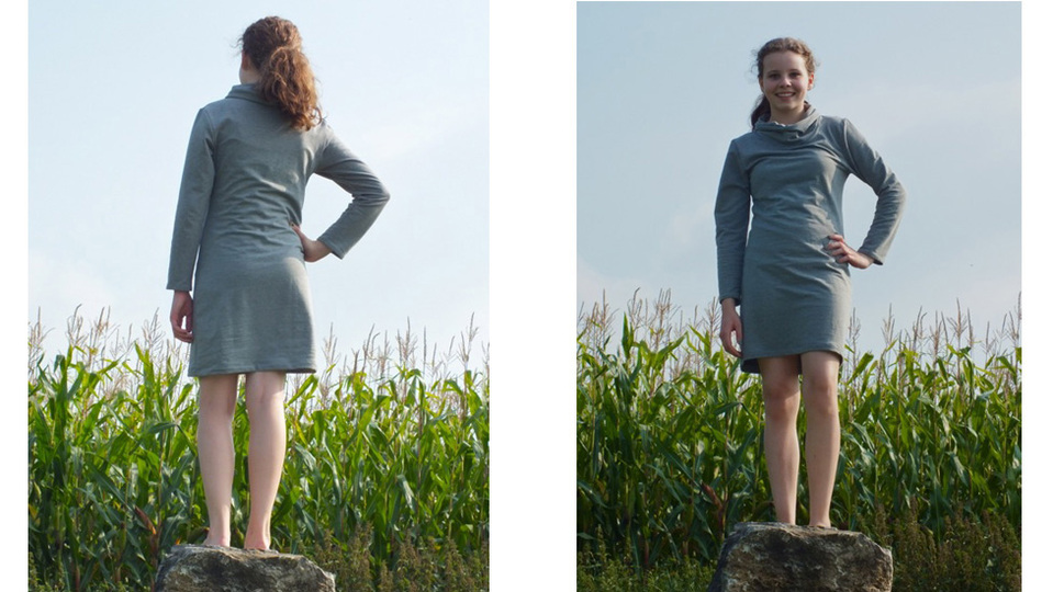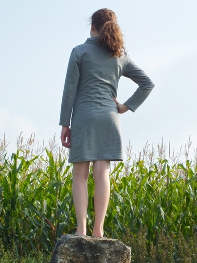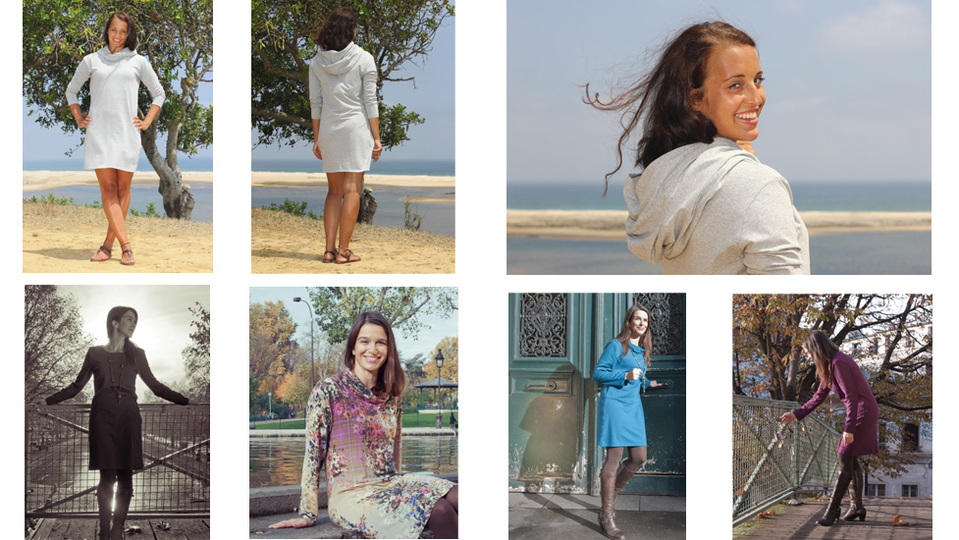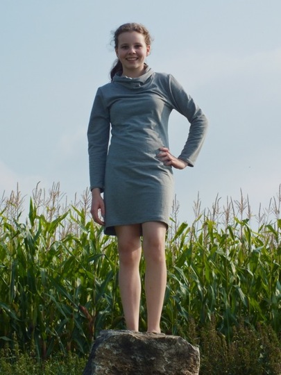 This dress is so pretty and easy to sew….You can sew this model either with a facing, shawl collar or hood. We explain every variation step by step in our eBook. Further we show you how to sew a jumper in our video. Look at our pictures and you will see how versatile this pattern is. You can combine this dress with tights and wear it the entire year!