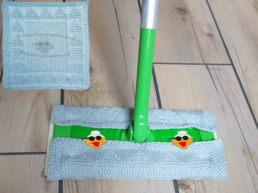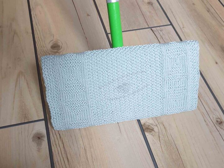 Du kannst die gestrickten Wischtücher genau wie die Wegwerftücher in die Vorrichtung auf der Oberseite eindrücken. Du kannst die Vorrichtung am Mopp mit Klettband überkleben und an deinen Wischlappen nähst du die andere Seite des Klettbandes an. So kannst du fix die Tücher wechseln, ohne Fäden zu ziehen.