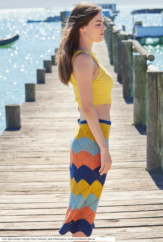 Das wandelbare, mit einem opulenten Wellenmuster verzierte Set aus einem Garn, halb Baumwolle, halb Leinen, begleitet dich beim Shoppingausflug ins Café und natürlich auch in den Sommerurlaub. Solo getragen, sorgen sowohl die doppelfädig gestrickte Tasche mit Ledergriffen als auch der wadenlange Rock mit Schlitz dank des fröhlich-kraftvollen Farbspiels aus Dunkelblau, Rost, Hellblau und Orange für bewundernde Blicke und werten so Uni-Basics modisch auf. Die Anleitung dazu steht für die Größen 36/38, 40/42 und 44/46 und für die Tasche mit 38 x 35 cm zur Verfügung.