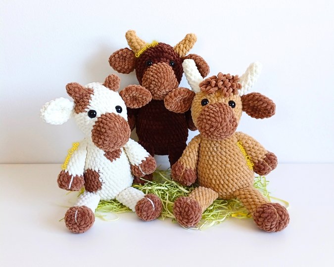 • Cinnamon, the Highland Cow (https://www.crazypatterns.net/en/items/106319/cinnamon-the-highland-cow-low-sew-cow-toy-crochet-pattern)