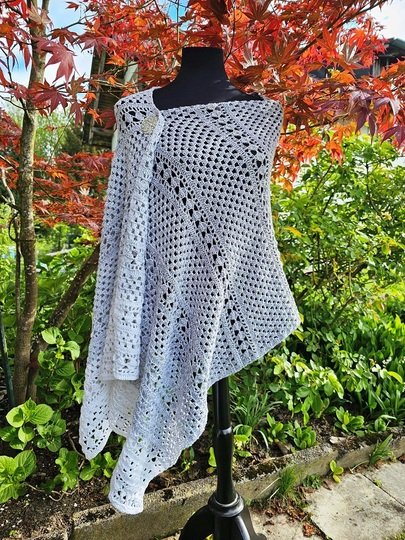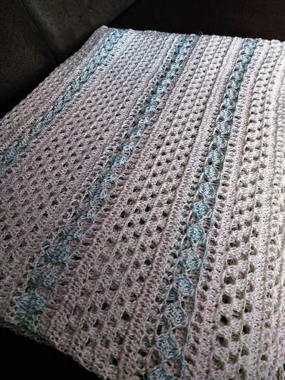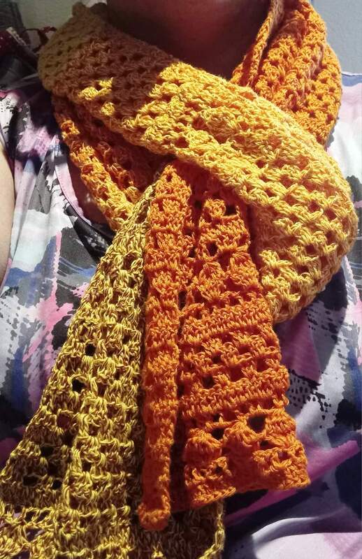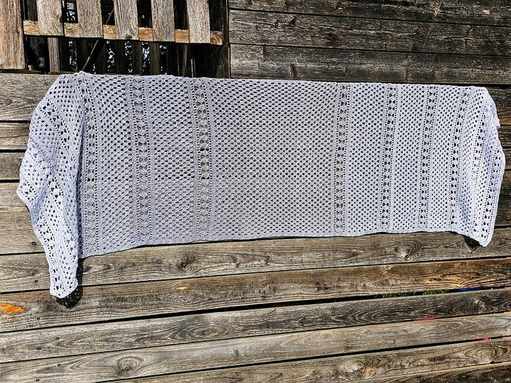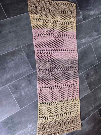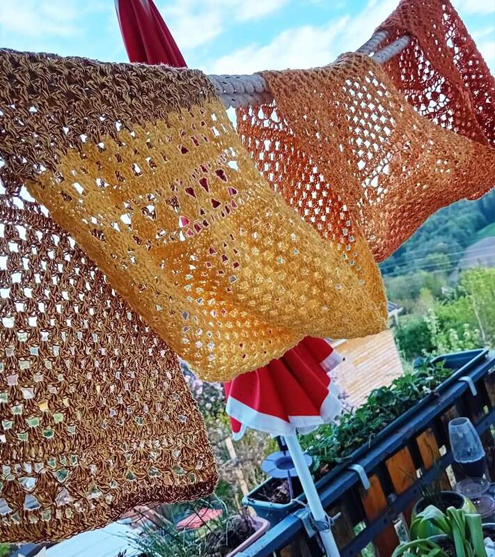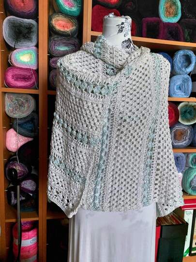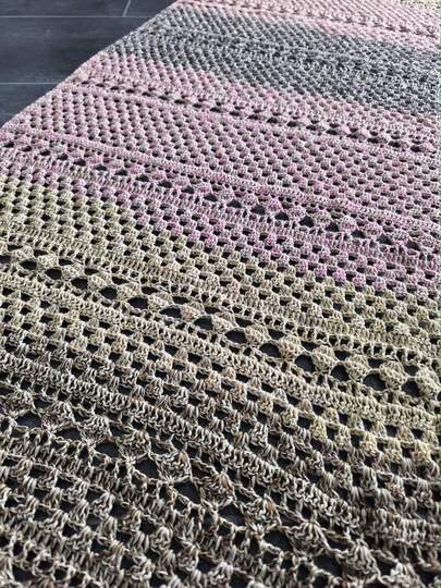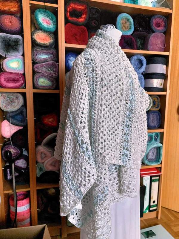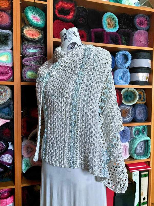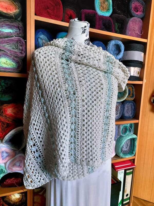 Es kann mit jedem gewünschten Garn gehäkelt werden, ich würde dazu einen Farbverlaufsbobbel empfehlen, die Lauflänge hängt von der gewünschten Größe ab. Ich habe für mein Tuch den Bobbel Elsa von Kandelas Handarbeitsbox mit 1500 m 4-fädig verwendet.