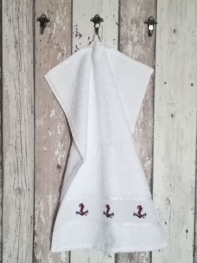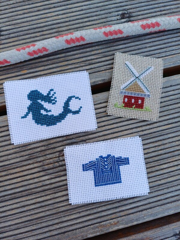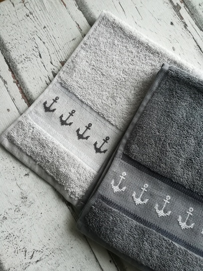 The embroidery patterns are simple and suitable for beginners. Most consist only of cross stitches, a few also require backstitches, and only the smallest anchor contains a few 3/4 stitches.