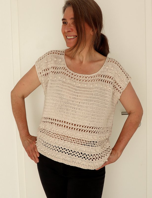 Shirt "Mayra" - thanks to four different exciting patterns, crocheting is never boring and the finished work is a real eye-catcher. Slightly oversized, the top lovingly flatters the figure and is super comfortable to wear.