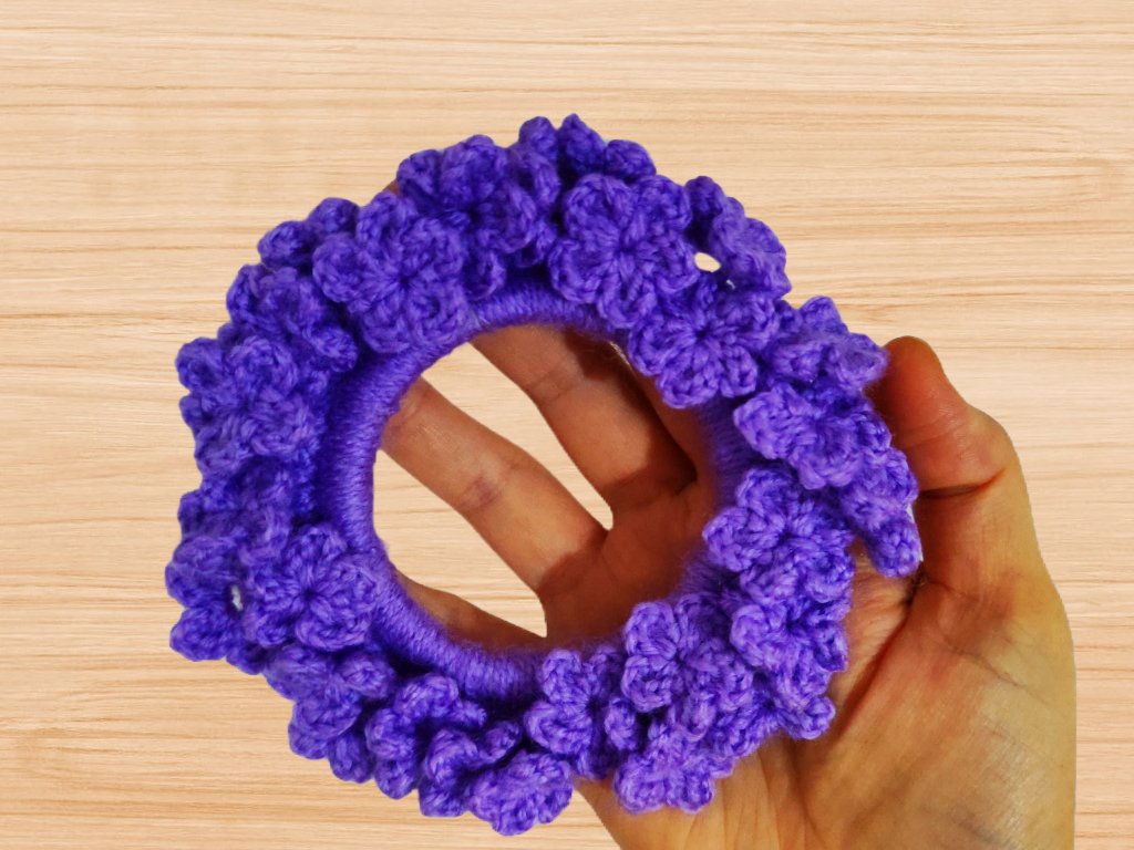 A Crochet flower Scrunchie pattern includes pictures for every step, gauge, stitch count and extra notes to help explain.