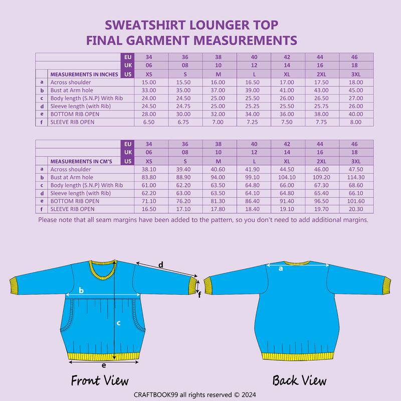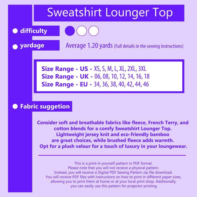 The Sweatshirt Lounger Top PDF Sewing Pattern is offered in sizes XS to 3XL for immediate download, covering US measurements. Make sure to check the size chart in the product gallery and instructions to select the correct size, including UK and EU measurements. Please remember that you won't get a physical pattern; instead, you'll receive a downloadable PDF file after purchase, with the download link sent to you.