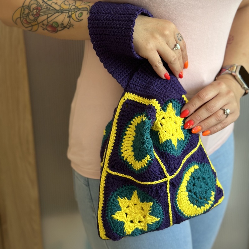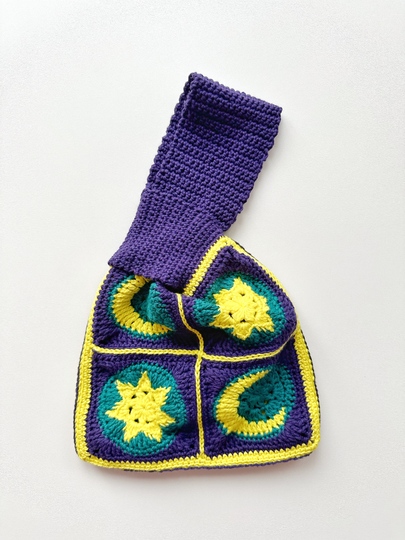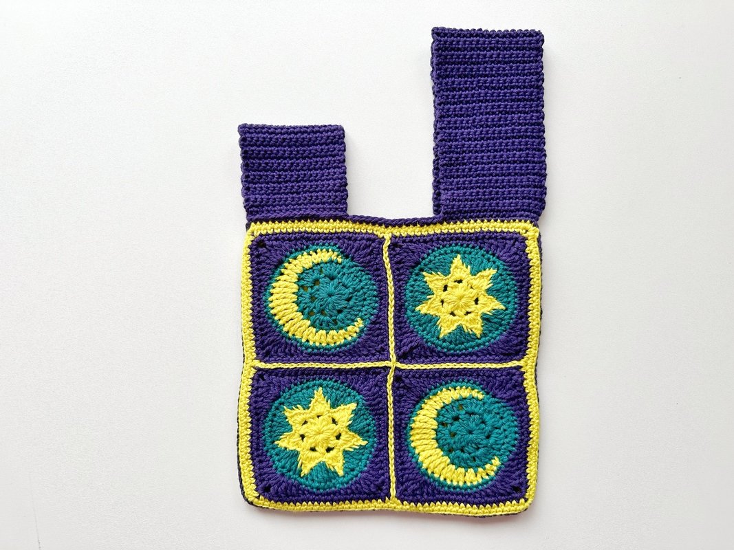 The Elenna Knot Bag is a gorgeous bag made of celestial themed squares, perfect for advanced crocheters.