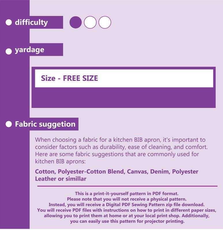 The Waist APRON PDF Sewing Pattern, available in FREE SIZE, is instantly downloadable. Refer to the size chart in the product gallery to choose the right size.