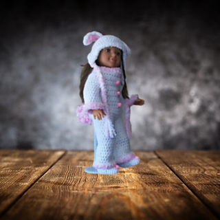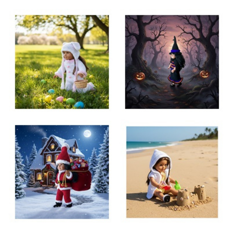 Here you will find 4 adorable outfits to fit the 18" doll. One for each season, Spring, Summer, Winter and Fall. A cute Bunny outfit, a Bikini Set, a Santa Suit, and a Witch Costume. Hours of fun and a great gift to make for the doll lover in your family.