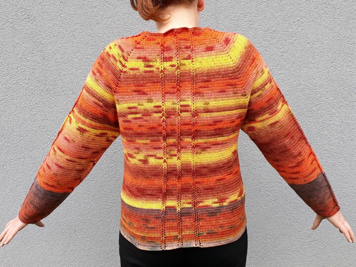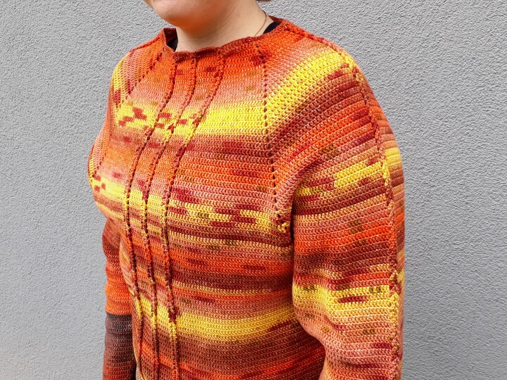 An einen farbstarken Sonnenuntergang in Afrika erinnert mich diese traumhaft schöne Wolle und inspirierte mich zu diesem gerade geschnittenen, lässigen Hosenpulli mit tiefem Ärmel. Er ist absolut alltagstauglich, auch für Männer und supereinfach zu häkeln.