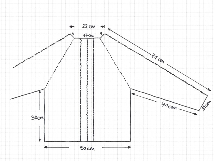 Der Pulli eignet sich für Kinder ab ca.10 Jahren und Erwachsene bis zu einem Brustumfang von 100cm. Bei grösseren Grössen werden die Ärmel sehr tief und damit zu Fledermausärmeln.