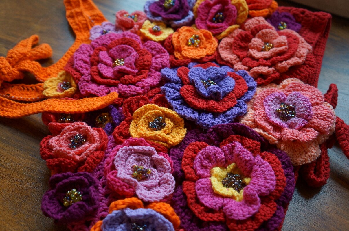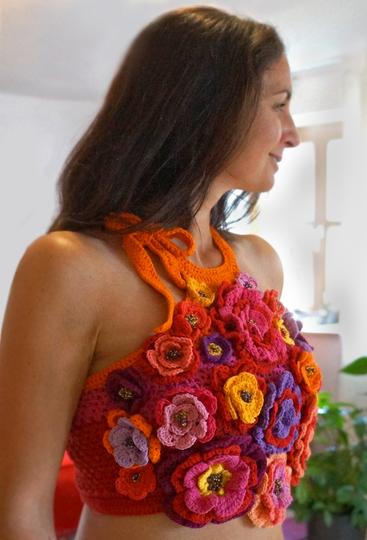You need approx. 200gr (100gr red, 50gr pink, 50gr orange) for the top without flowers. The flowers can be crocheted with colorful leftover wool. A total of approx. 150 grams of yarn is required for the flowers.