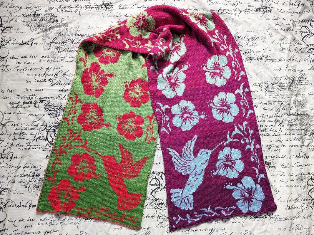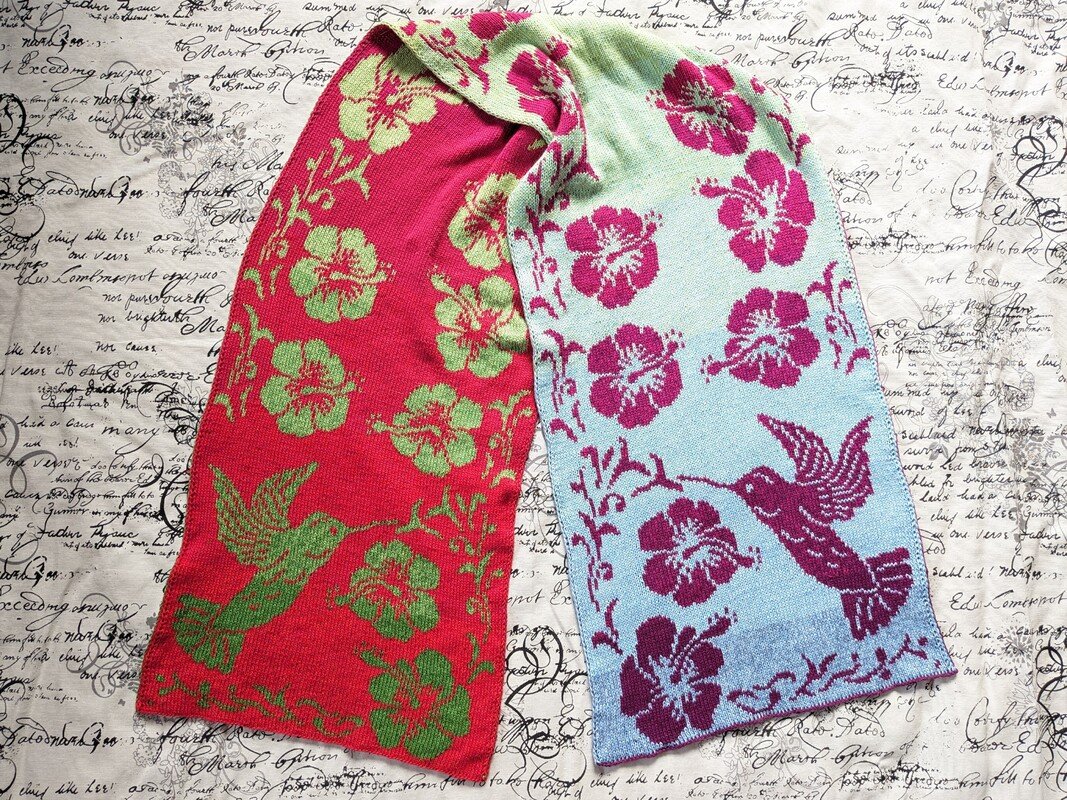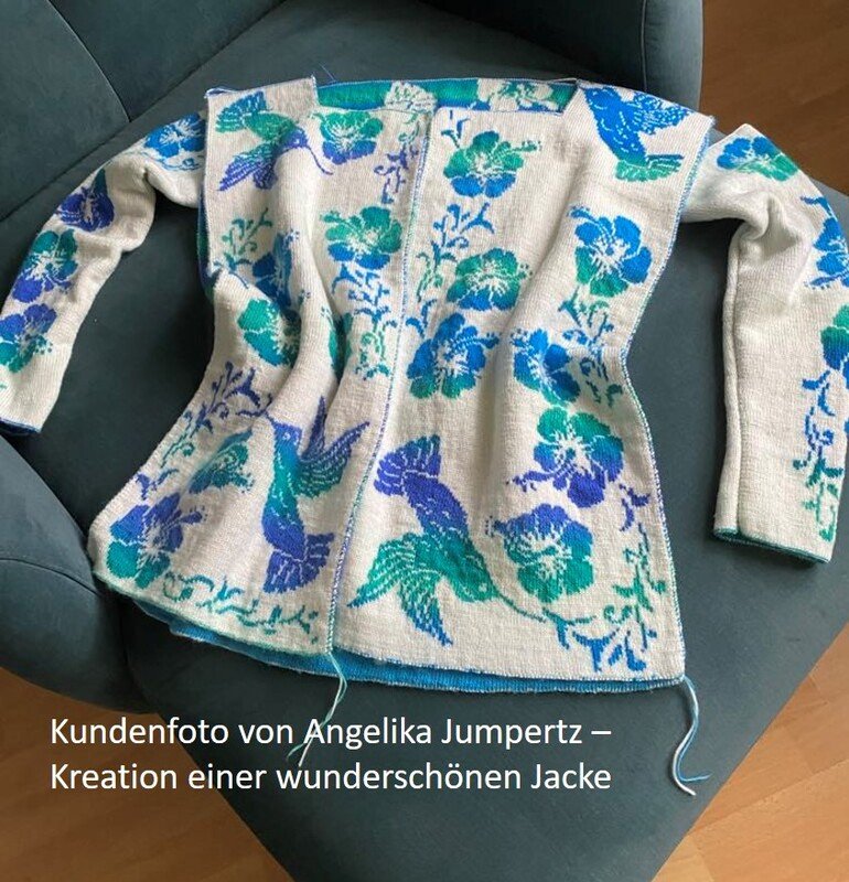 This tropical floral splendour with the hummingbirds is simply a joy, isn't it? You can wear the wrap on many occasions – wear it over a dress on warm summer evenings or snuggle up in the office or on the sofa in autumn/winter. Thanks to different knit sections, you can easily adjust the length to suit your personal preference. A little tip: the knitting pattern with the hummingbird is the perfect size for a placemat
