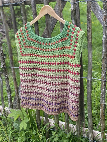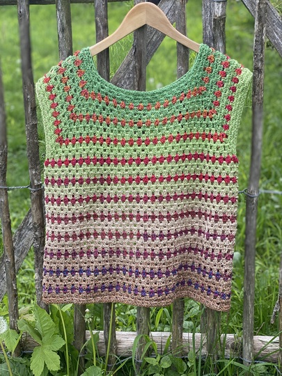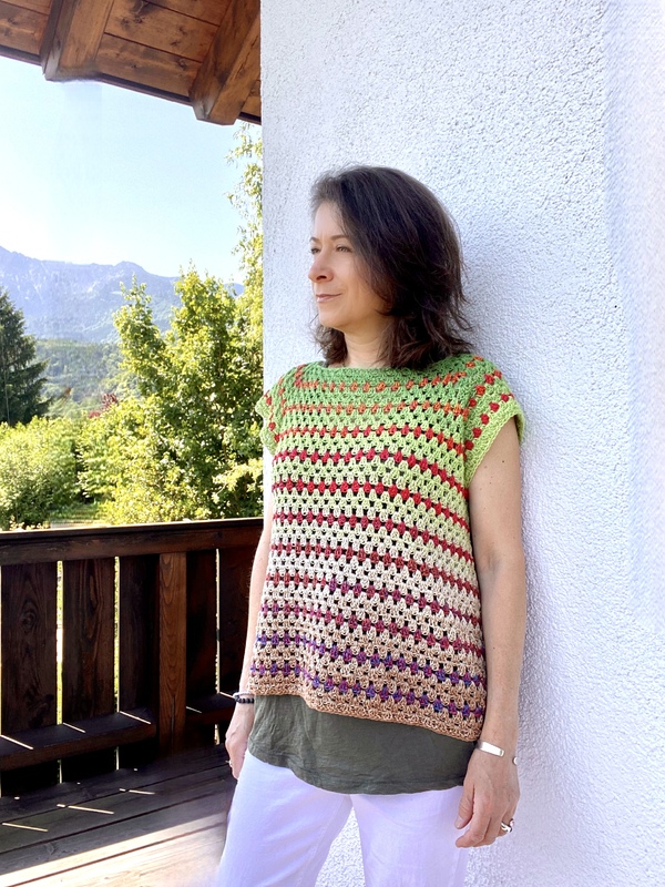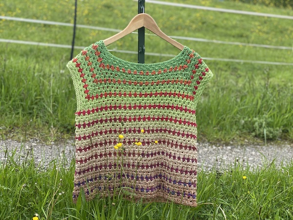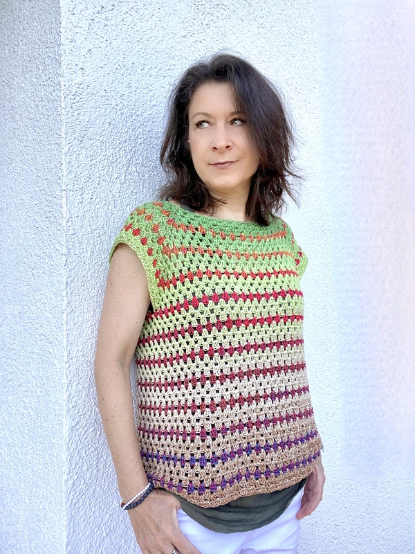 Do you like Granny stripes? The Summer Of Love Raglan Tee is a fun project! It is worked seamlessly from the top down. You will begin at the neckline, increase in a raglan style to shape your sleeves and body, and then separate. After that, you will finish the body. The raglan shaping creates a yoke that flatters every body and that is highly functional. For a longer or shorter tee the length can be adjusted.