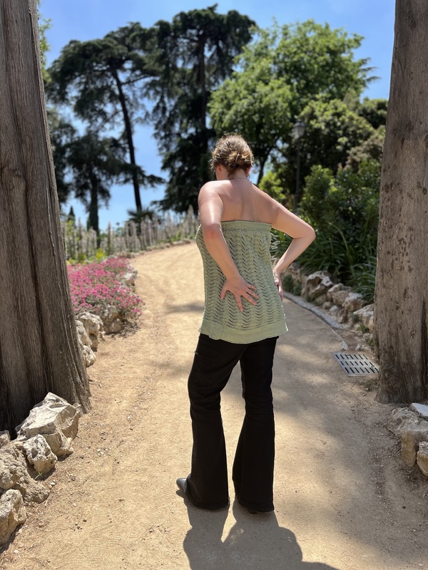 A light and delicate strapless summer top that is perfect for a summer city trip or at a festival. The top, made entirely of crochet yarn, impresses with its 3D wave pattern and also makes it look summery and light.