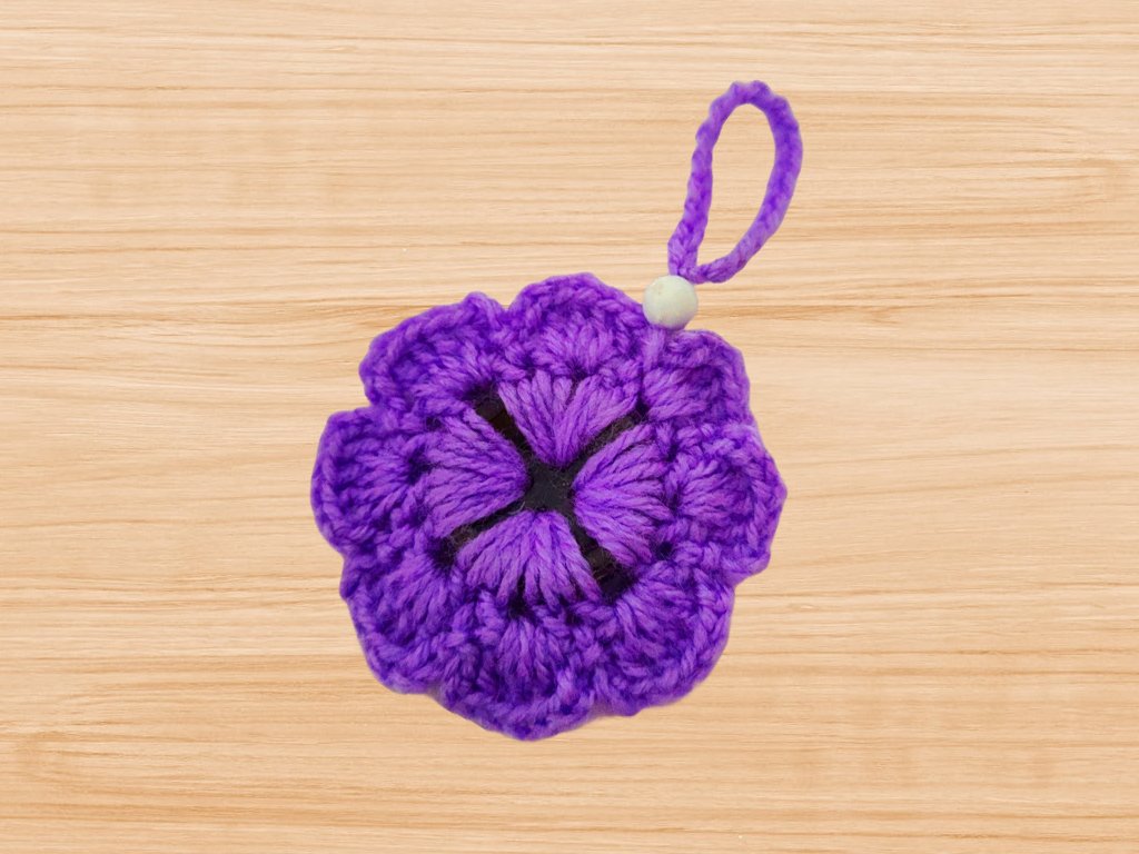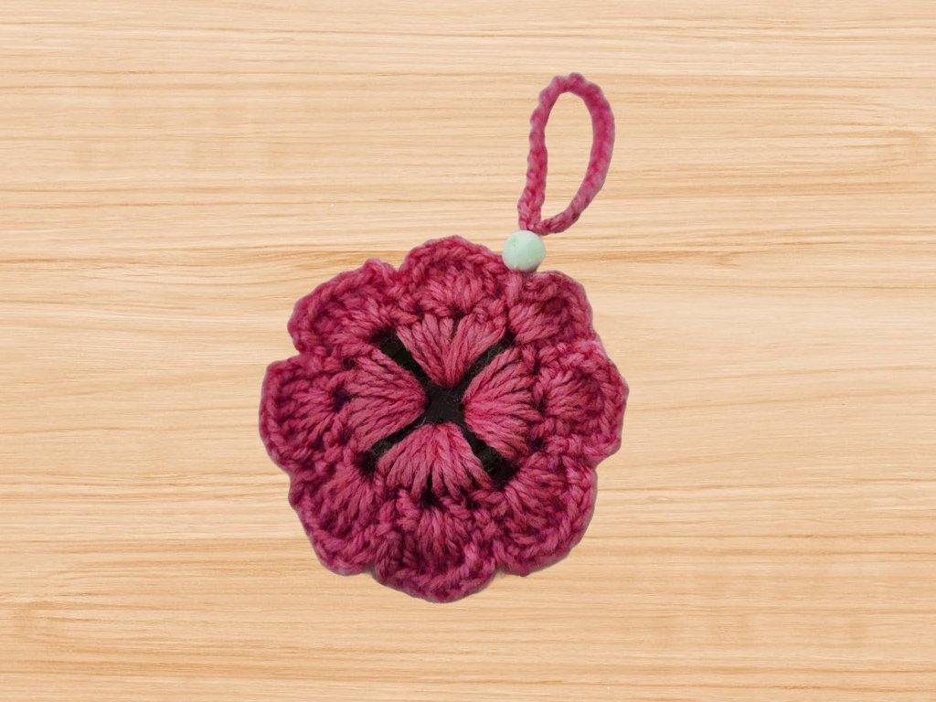 Crochet 3d flower keychain pattern includes pictures for every step, gauge, stitch count and extra notes to help explain.