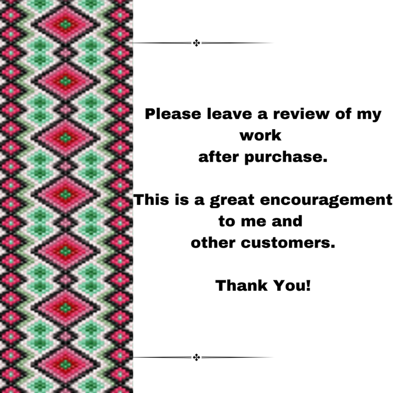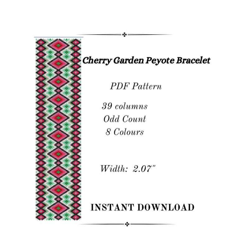 Introducing the "Cherry Garden" peyote stitch bracelet pattern! This exquisite design captures the vibrant beauty of a blooming garden with striking red and green diamond shapes intertwined with intricate black details. Perfect for both novice and experienced bead weavers, this pattern provides clear instructions and a stunning result. "Cherry Garden" adds a touch of elegance and color to any outfit, making it an ideal accessory for any occasion. Elevate your beadwork collection with this charming and sophisticated bracelet pattern, inspired by nature's splendor.