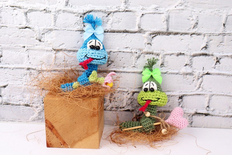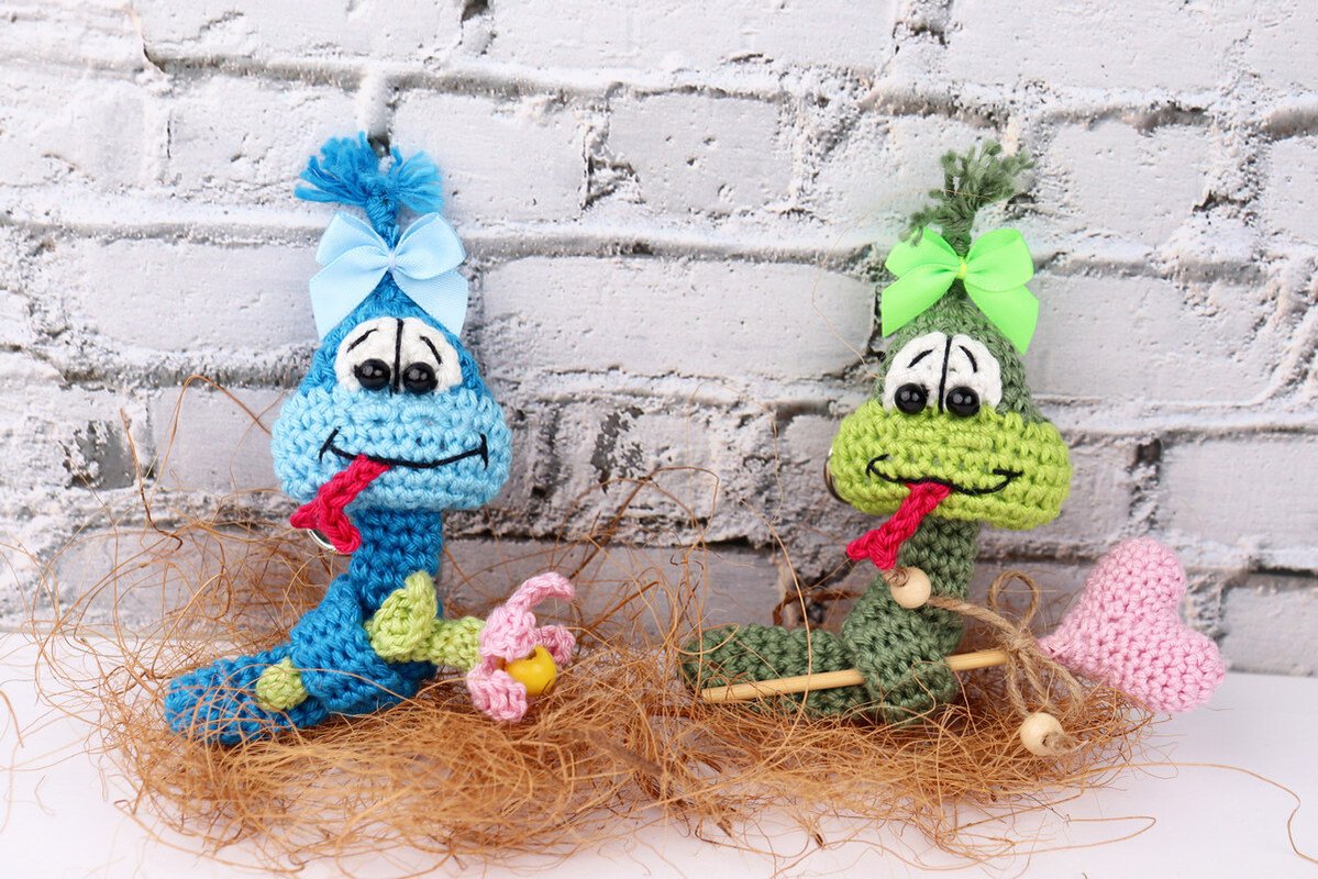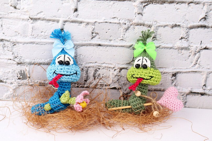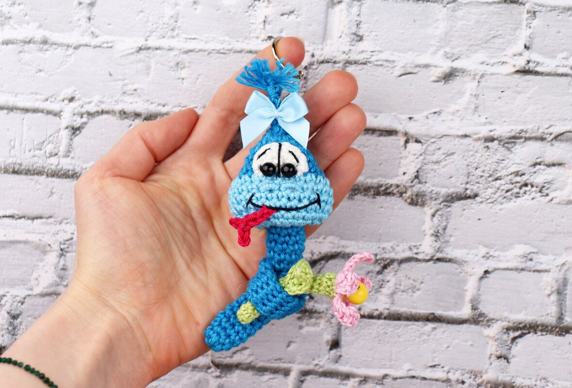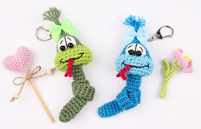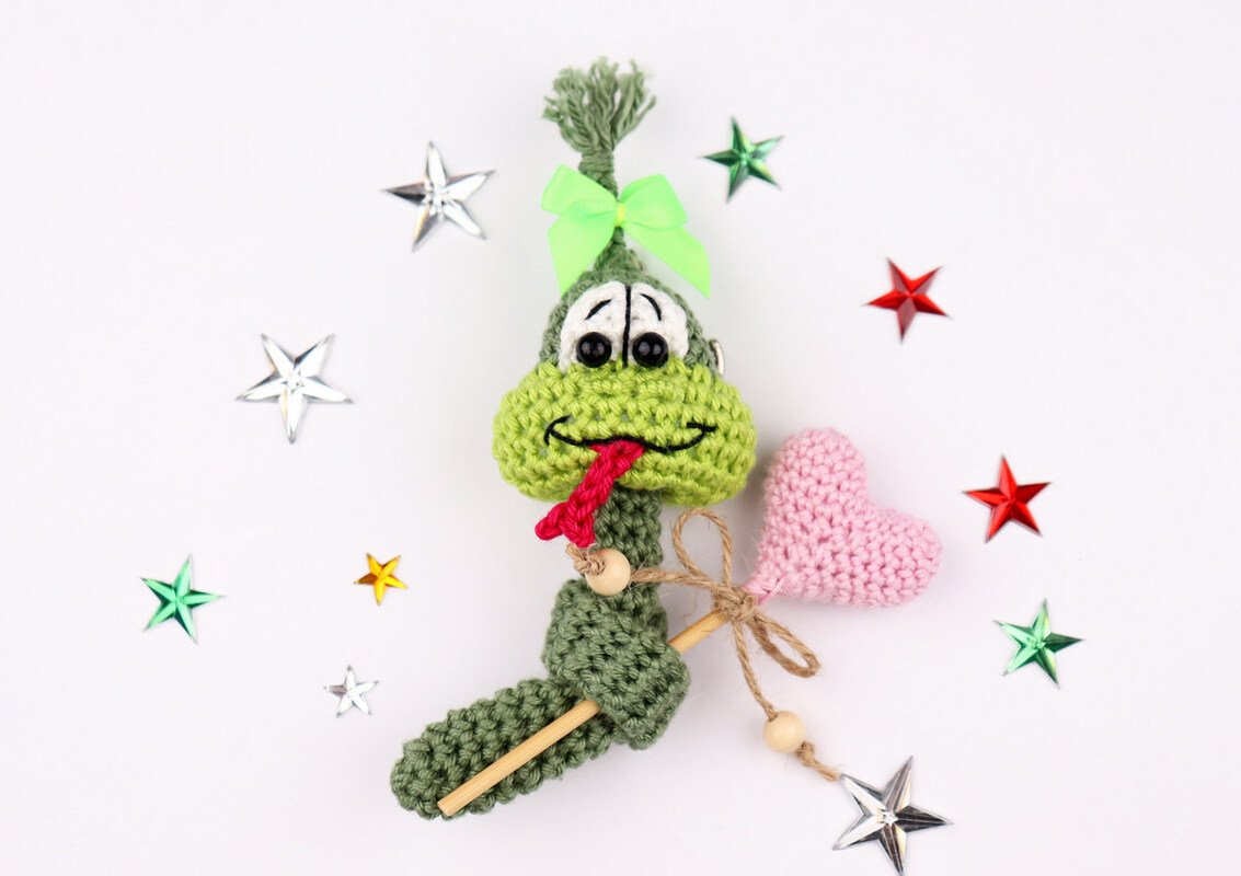 The extensive, richly illustrated PDF crochet pattern for crocheting the "Snake" keyring pendant as a gift for friends, as a decoration or pendant. The snake is described in two versions, with a flower or with a heart on a stem.