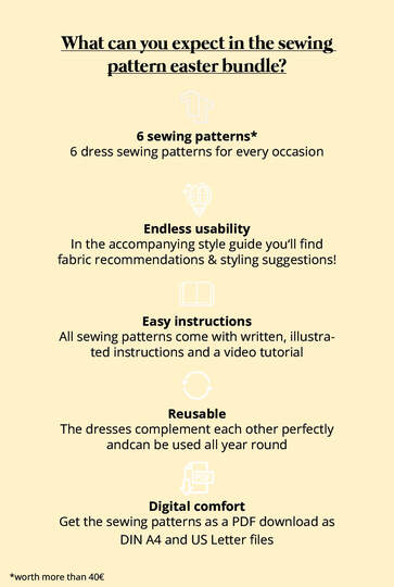 Easy sewing patterns: The dress pattern bundle consists of modern patterns that are just as suitable for beginners as they are for sewing professionals. There is an ebook for all the patterns, in which you will find all the information and tips on buying fabric, the lay plan, correct washing, etc. The sewing patterns are included in sizes XS-XXXL.