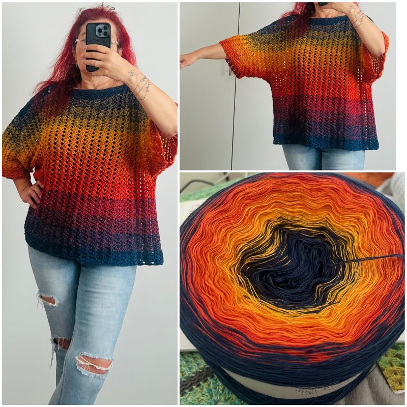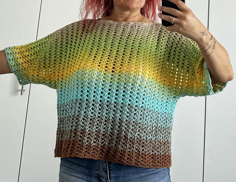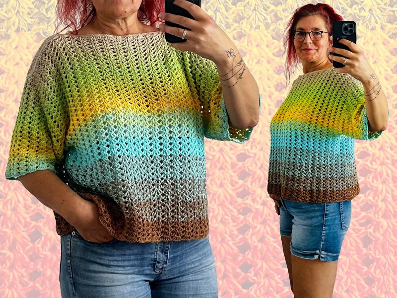 Ich habe Ida 2x gehäkelt, einmal das größere dunklere Modell mit Modal und etwas weiter und das hellere Modell aus Baumwollmischung etwas schmaler und so sind auch die rme kürzer.
