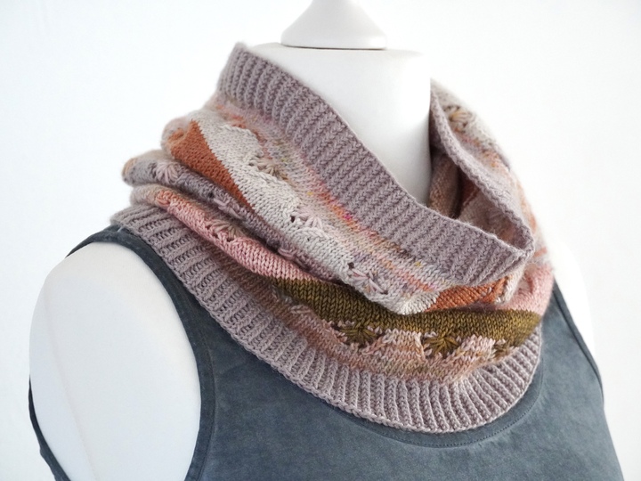 Who knits a lot knows the problem: over time, numerous leftovers, mini skeins, calendar yarns and single balls of yarn accumulate. With this cowl, you can use up all 4-ply sock yarn scraps, fingering and light fingering yarns and thus reduce your stash in a simple and beautiful way!