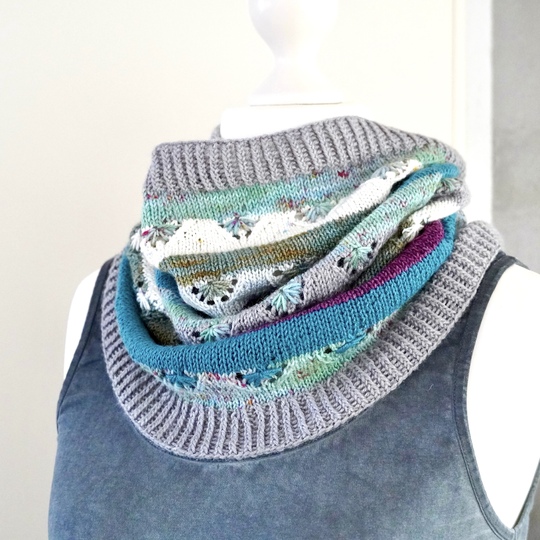 This cowl is knitted in Pattern Stripes, mainly in Stockinette. The stripes are enriched by a simple Lace Pattern into which small, charming “Dandelions” are worked. This is very quick and easy to do with the help of a crochet hook. You can knit by chart or written descriptions of the patterns, and there are also photo tutorial for the “Dandelions” so that even experienced beginners will succeed.