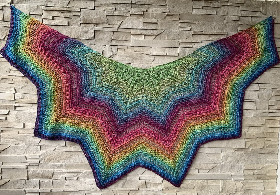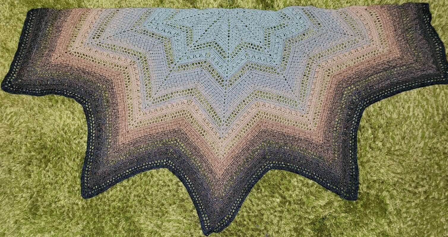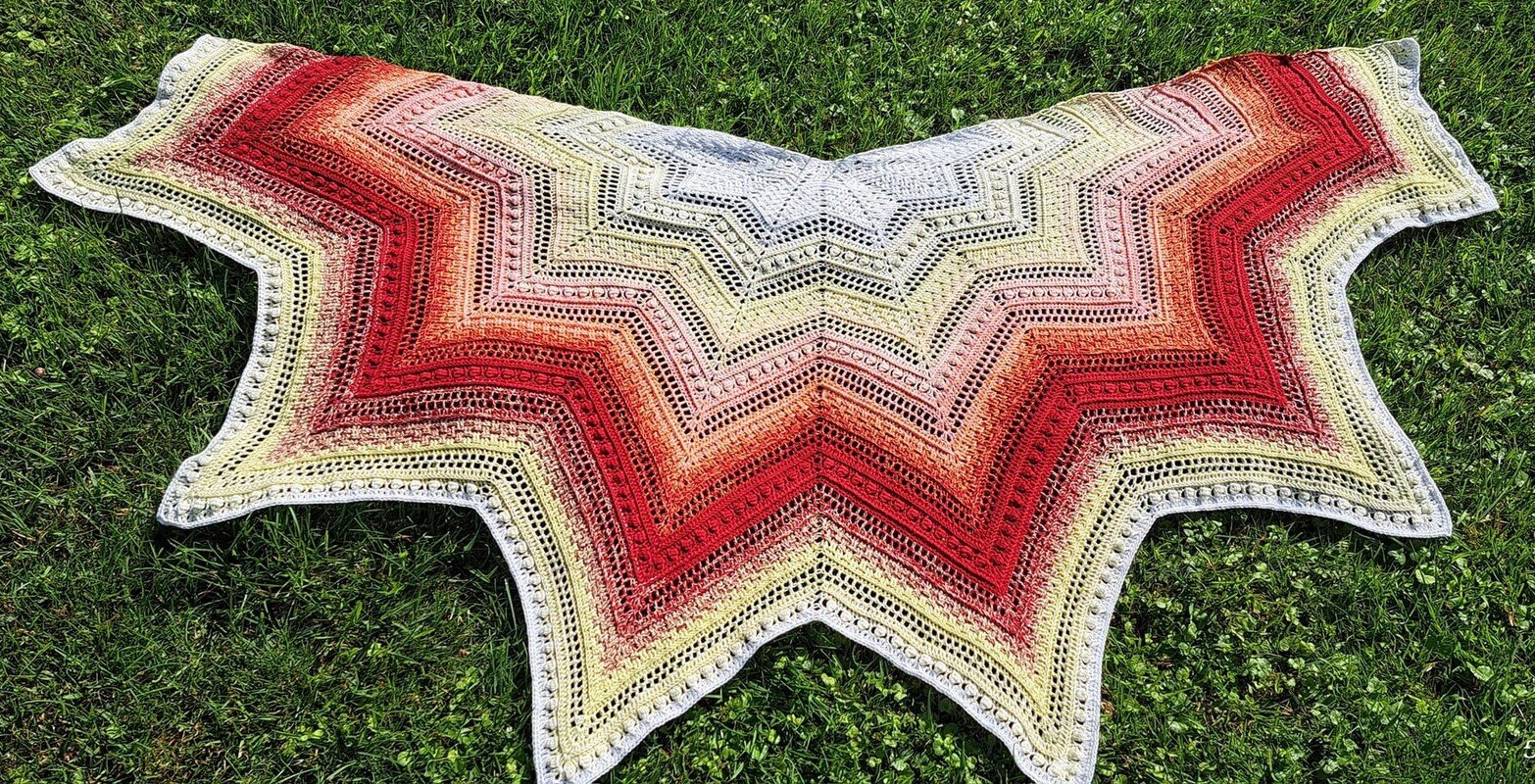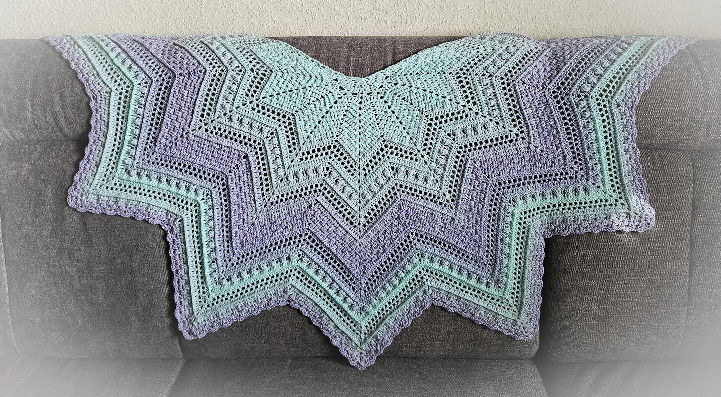 Persephone is a beautiful star-shaped scarf that can be crocheted in any size as the rows repeat. The scarf can be crocheted with 5, 6 or 7 star tips.