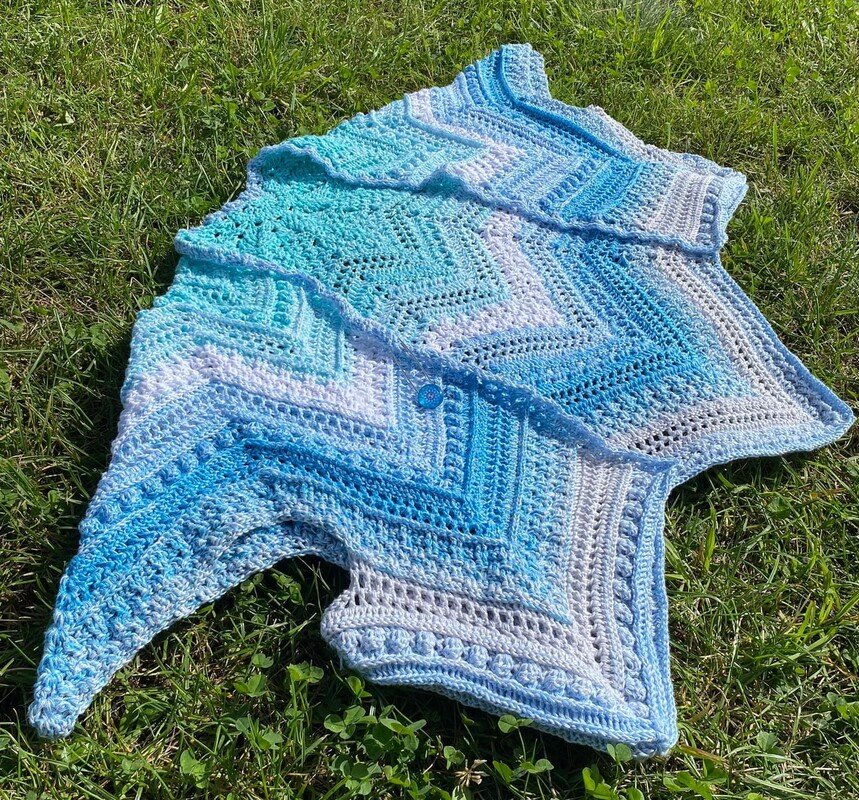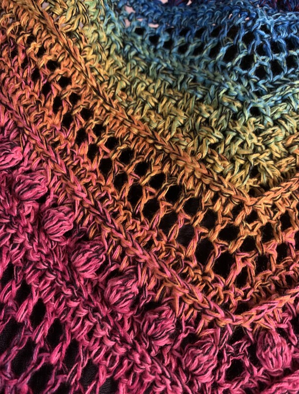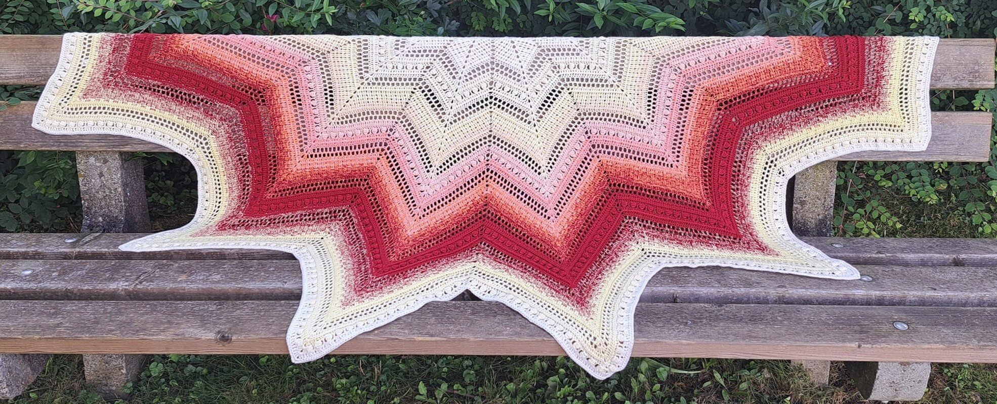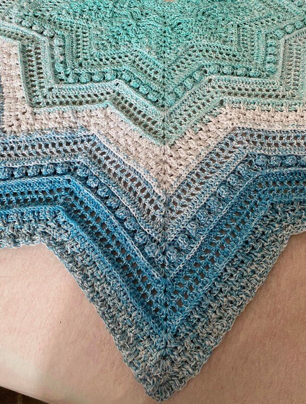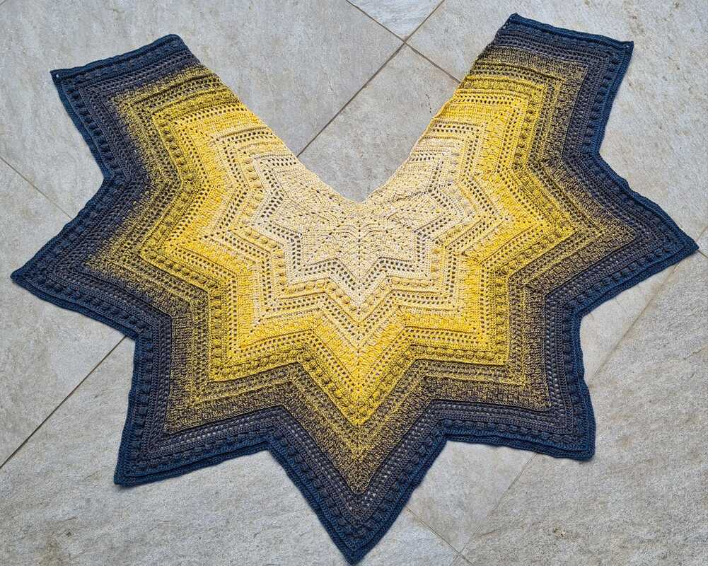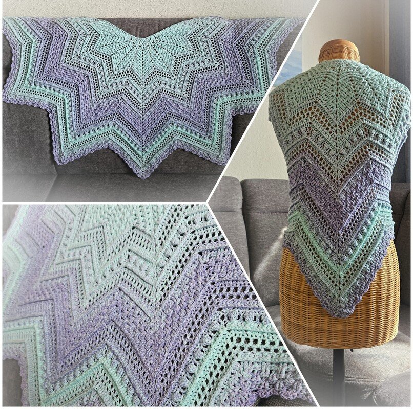 Persephone is a beautiful star-shaped scarf that can be crocheted in any size as the rows repeat. The scarf can be crocheted with 5, 6 or 7 star tips.