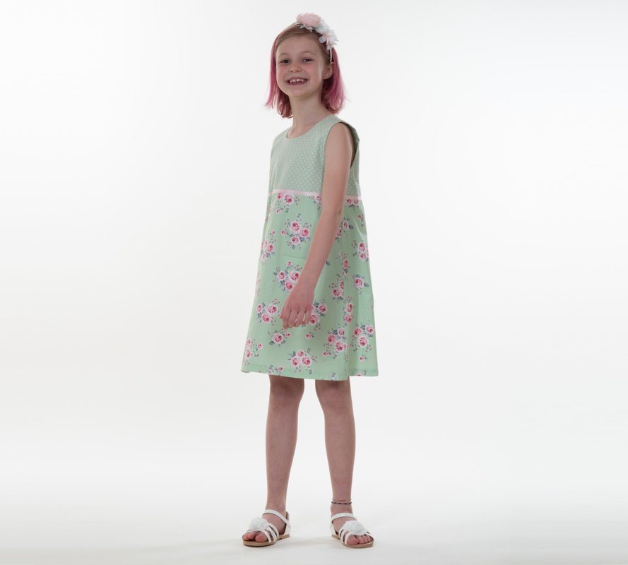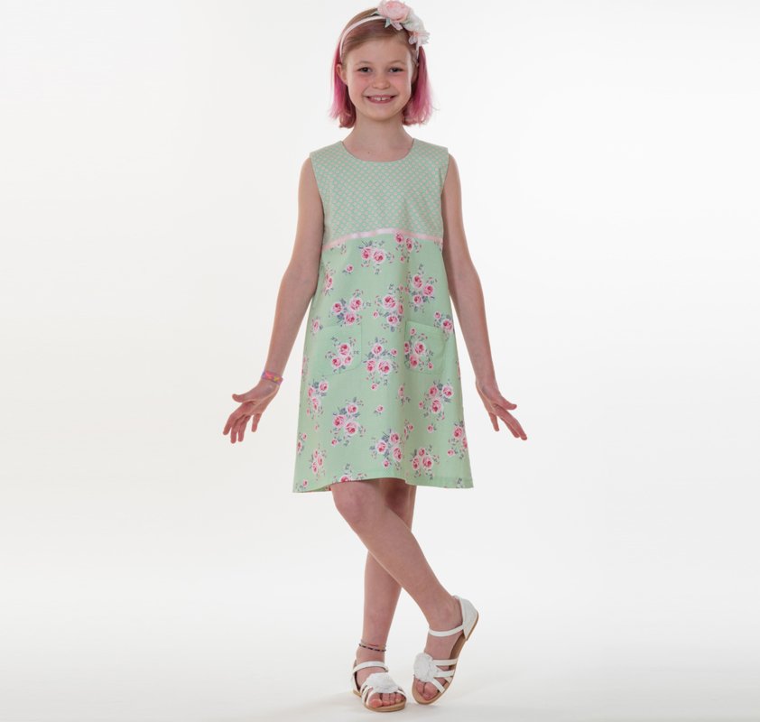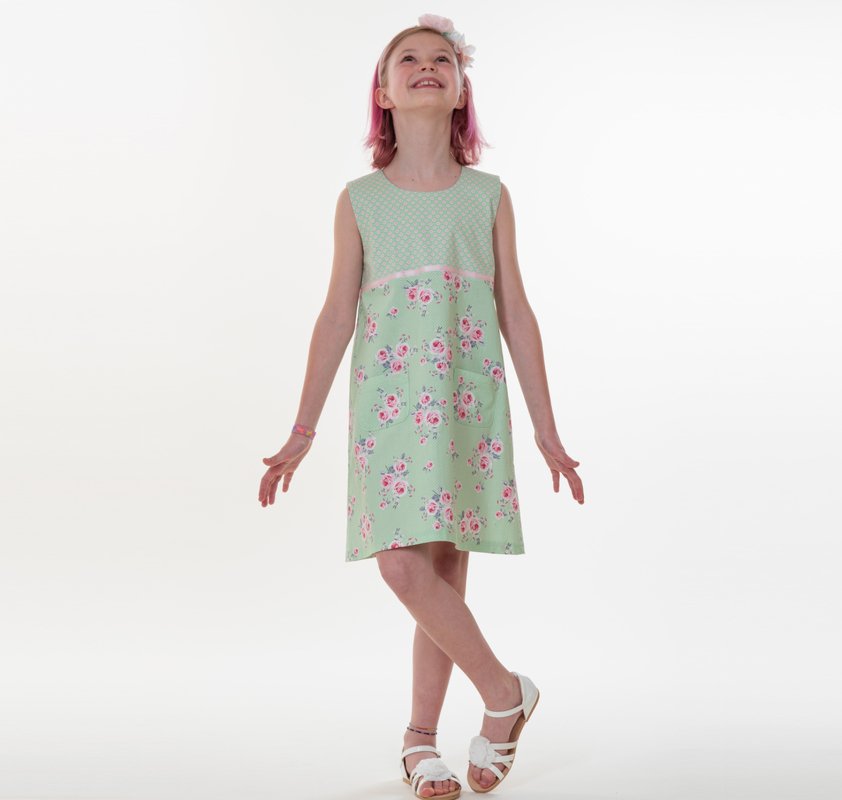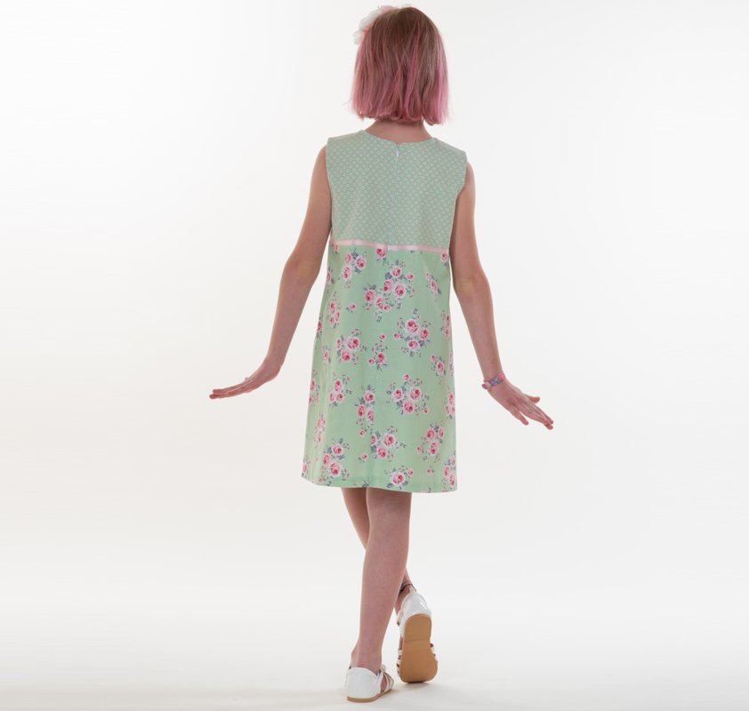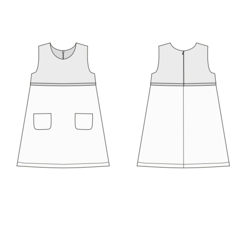 This digital sewing pattern helps you sew the sleeveless A-line dress GEMMA for kids. It is a versatile all-season dress: wear it on its own in summer, or layer it with a T-shirt and tights in winter. A concealed zipper creates a neat fit, plus a practical pocket and a decorative trim for a lovely finish.