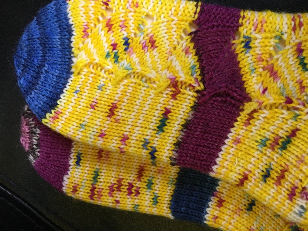 Ich habe 4-fach Sockenwolle fürs Verarbeiten gewählt. Die Socken können aber auch mit verschiedenen Resten (immer jeweils ein Mustersatz hoch), gearbeitet werden. Zu beachten ist nur, dass das Muster bei wilden, sehr bunten oder dunklen Farben nicht so gut zur Geltung kommt.