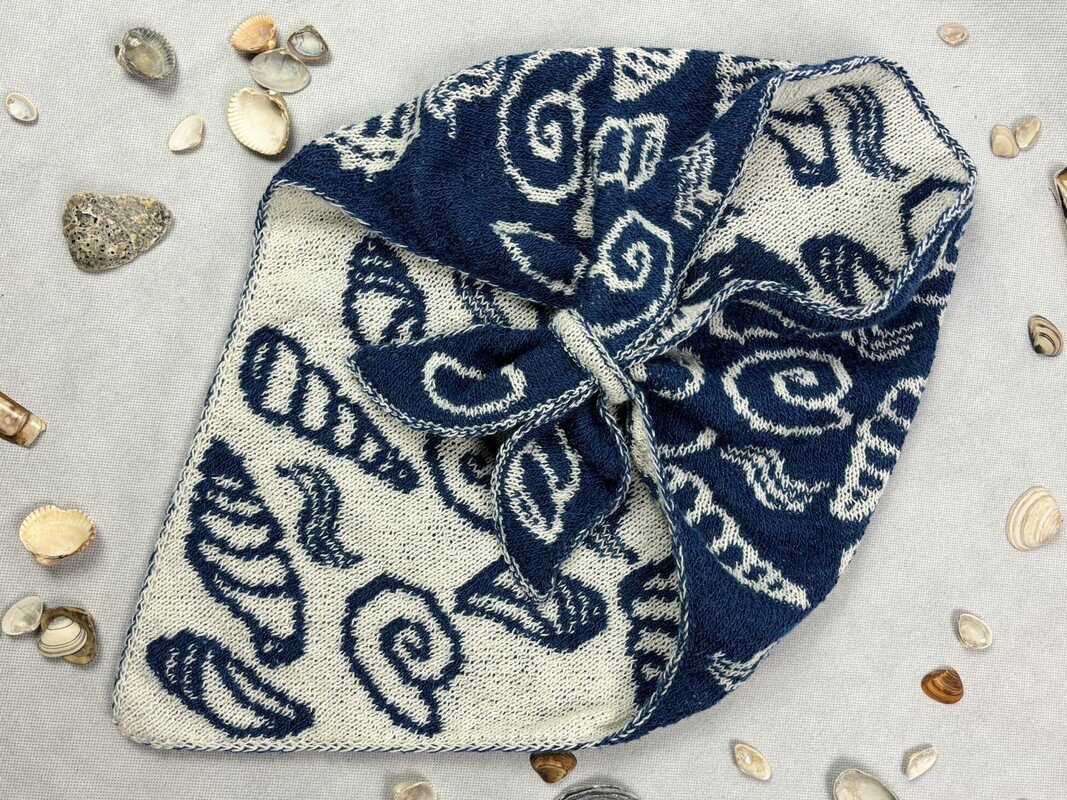 This shawl, which is knitted using the double knitting technique, guarantees many hours of knitting fun in which one shell after the other comes to light. So, you can really look forward to your next visit to the beach. In terms of size, this scarf is also ideal for a visit to the beach, which can sometimes be a little breezy. Large enough to cover the shoulders and small enough not to flap too tightly in the wind. The practical scarf ring (which is also described in these instructions) keeps the scarf elegantly in place.