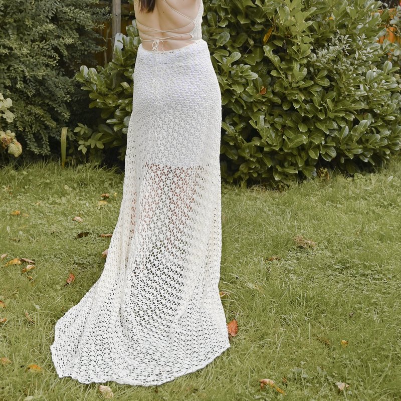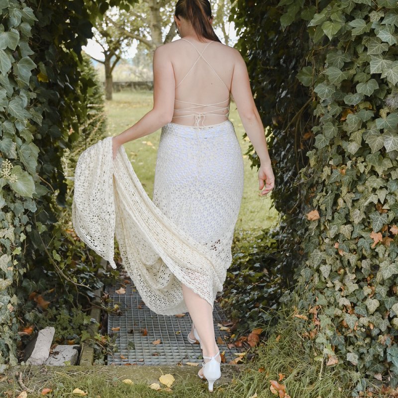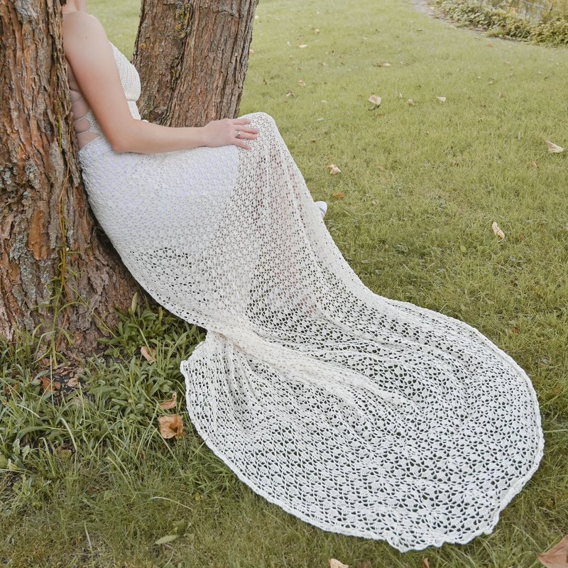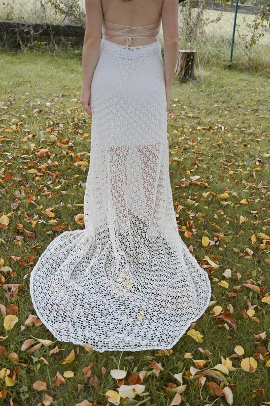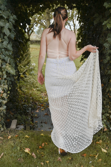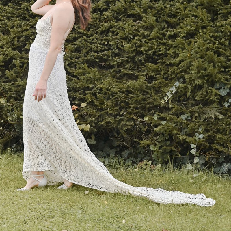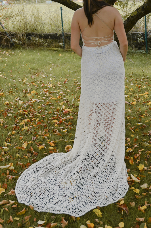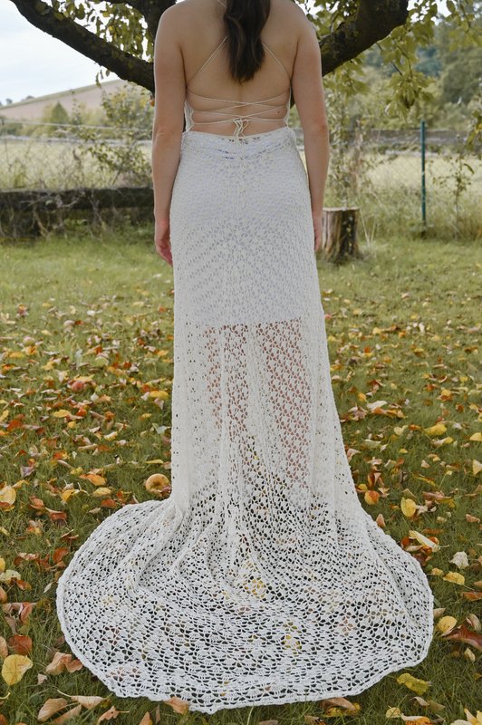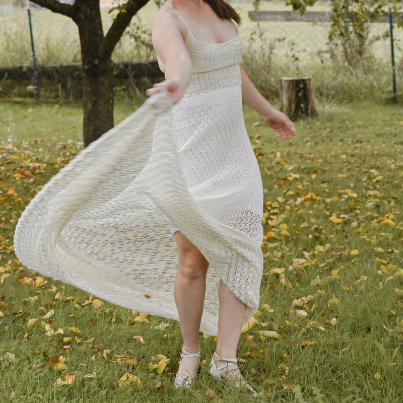 cotton yarn (lace weight, e. g. 285m/50g, but you can use any type of yarn, which may of course affect the required amount; the pictured dress is for a hip circumference of 102cm and a body height of 162cm and it used approx. 750g of yarn)