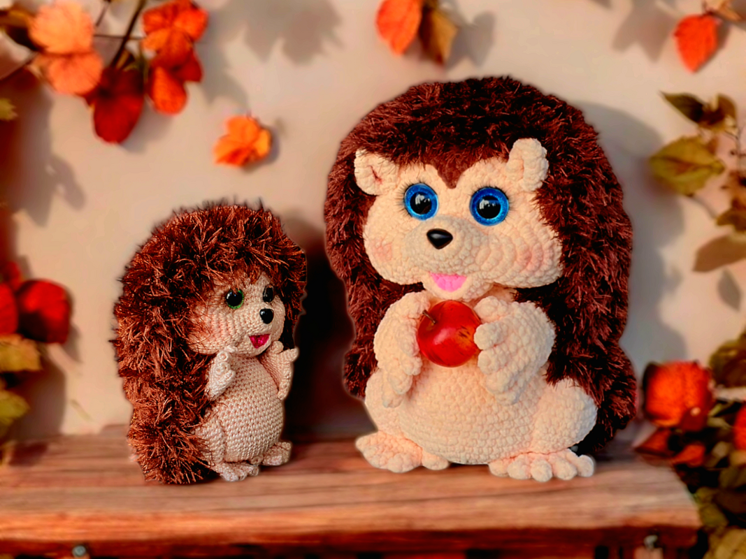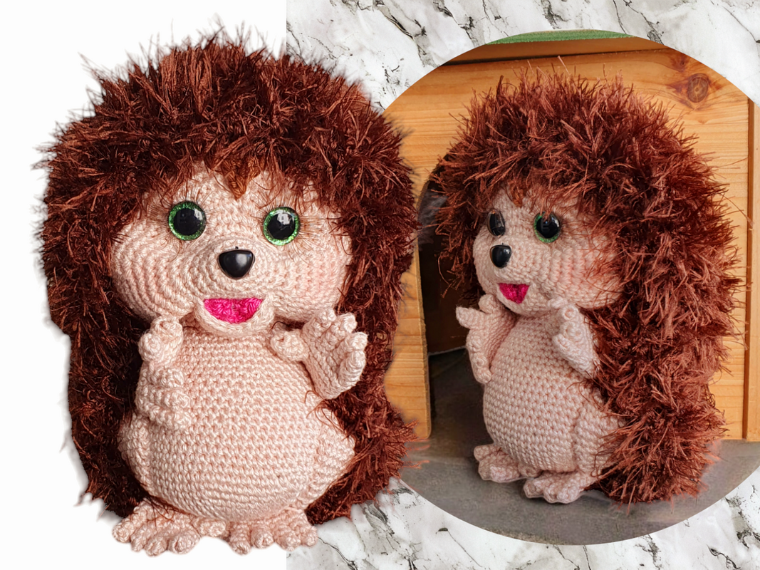With the help of these detailed and illustrated step-by-step instructions, you can crochet Immi in both chenille and cotton. The instructions include the description for both hedgehogs. The special thing about Immi is the "spiked dress" which is crocheted from fringed yarn. As the stitch pattern is difficult to recognize with fancy yarn, I have used a trick where the stitch pattern does not have to be recognizable. This is explained in detail in the instructions so that anyone can crochet a pretty "spiked dress" with fringed wool. The apple is for decoration and is not part of the instructions. Immi's friends (lion, monkey, raccoon, frog, koala, bee) are also not included in these instructions. There are separate instructions for each friend. You can find them here: https://www.crazypatterns.net/en/store/Marili-Designs